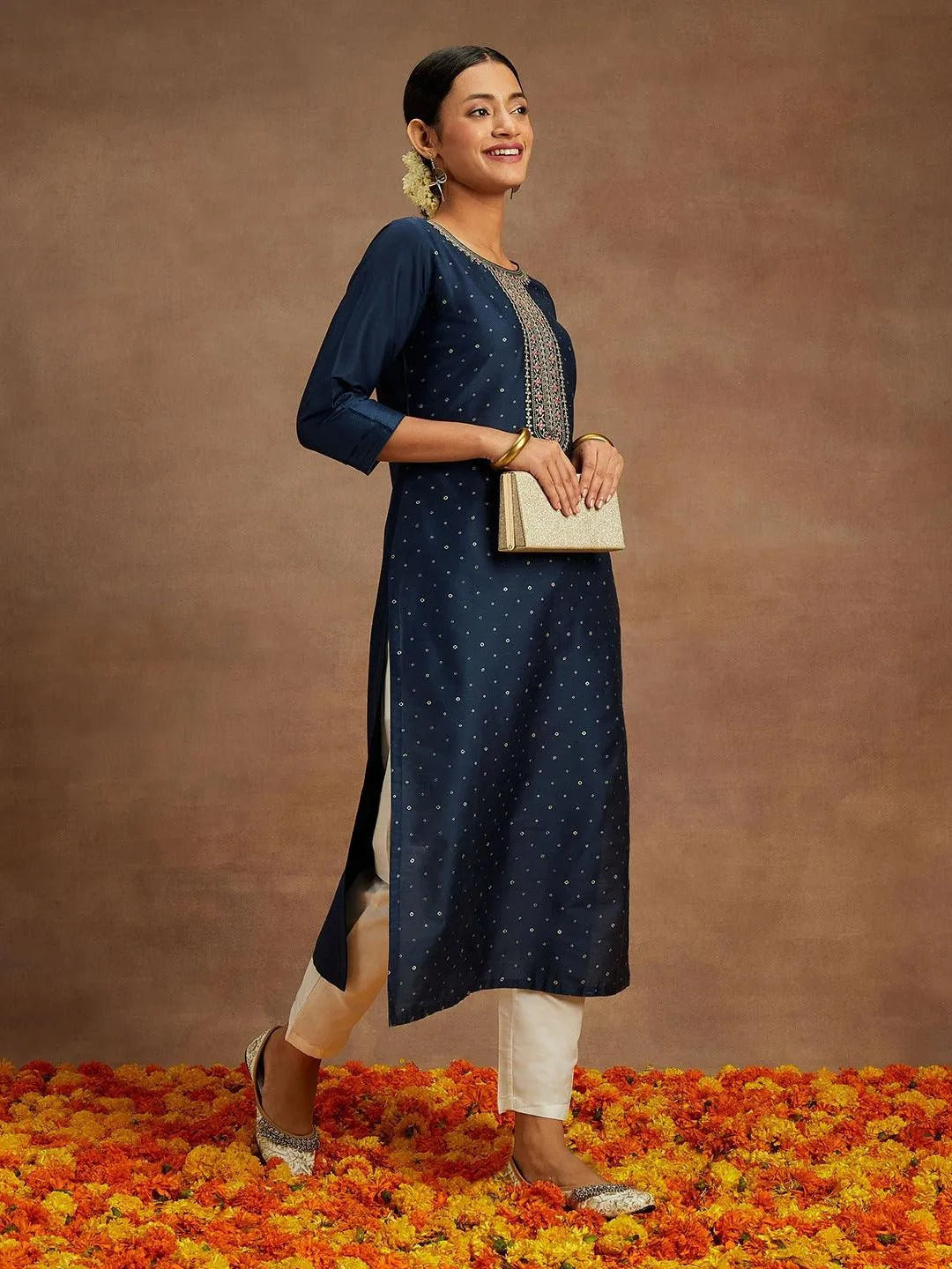 Our navy blue and gold-toned silk kurta features a straight-fit round neckline kurta with ethnic motif embroidery, three-quarter sleeves, and threadwork detailing. Ideal for light festivities.