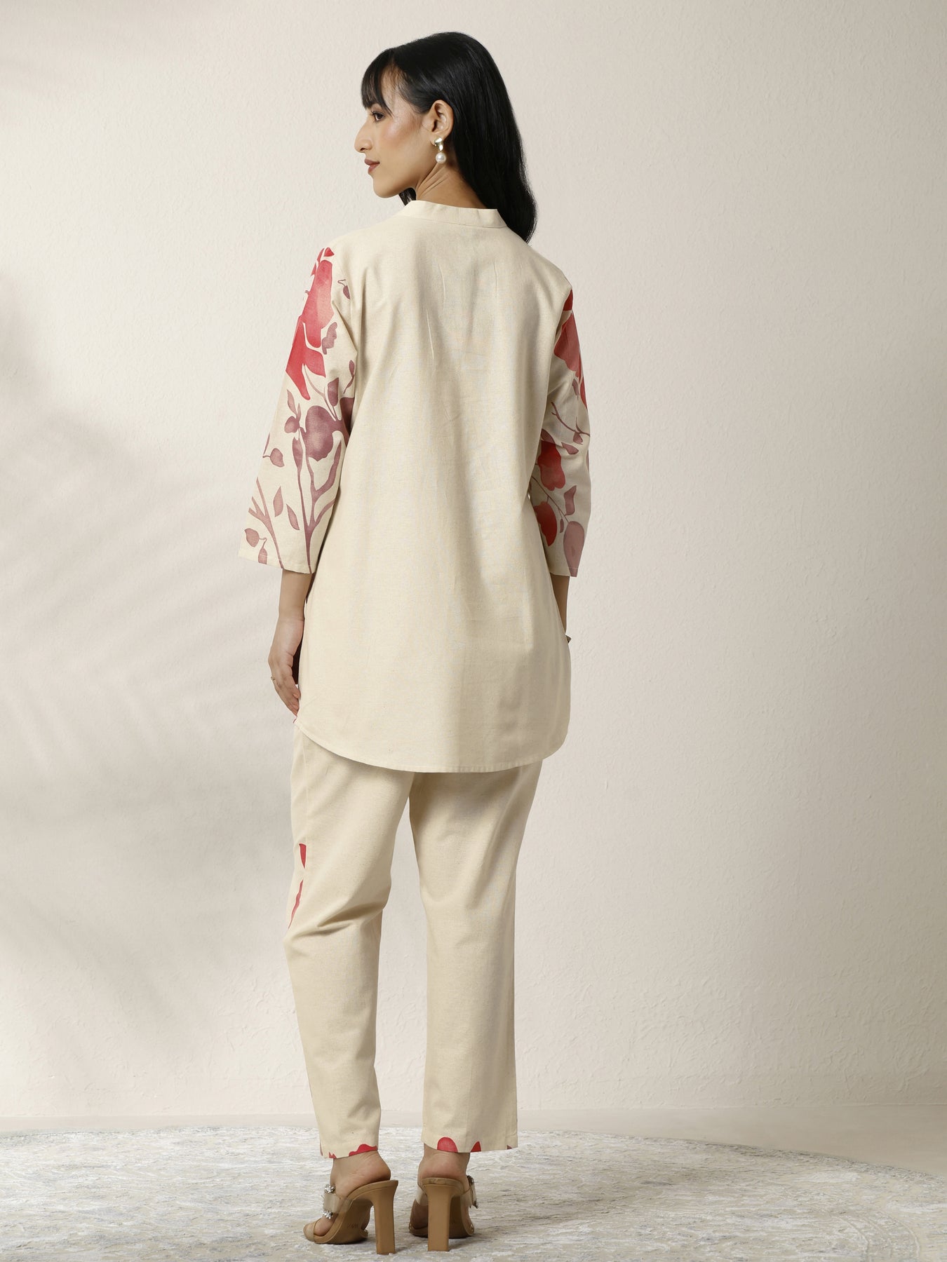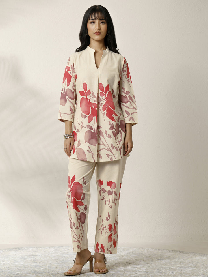 Our 2-piece off white printed cotton blend co-ord set features a Straight-fit Tunic with a Mandarin Collar neckline and Three-quarter sleeves. Complemented with matching Trousers with a Partially Elasticated waistband and 2 pockets. Highlighted with Top Print, this style is perfect for Work Wear and Casual Wear.