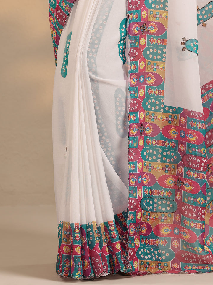 Our White Printed Silk Blend Saree Features Captivating Ethnic Motifs Print. Complemented With A Blouse Piece. This Charming Saree Is Perfect For Festive Occasions.