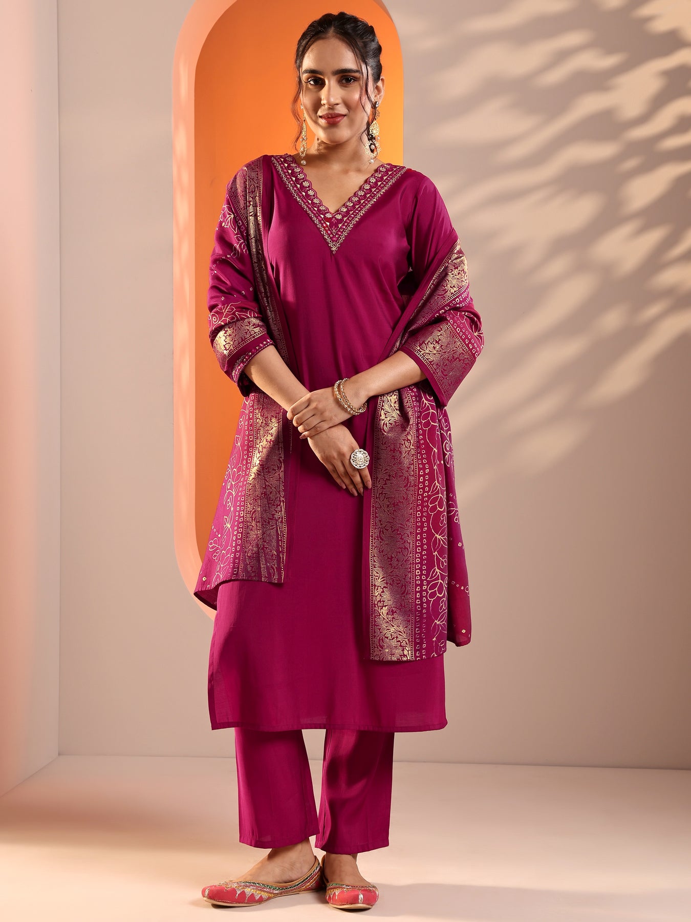 Our 3-piece Magenta Silk blend Straight-fit Kurta Set features a V-Neckline, Regular Sleeves, and statement yoke design. Complemented with Straight Pants with a Partially Elasticated waistband and 2 pockets, and an Embroidered dupatta. Adorned with Embroidered accents, this style is perfect for Dark Festive occasions.