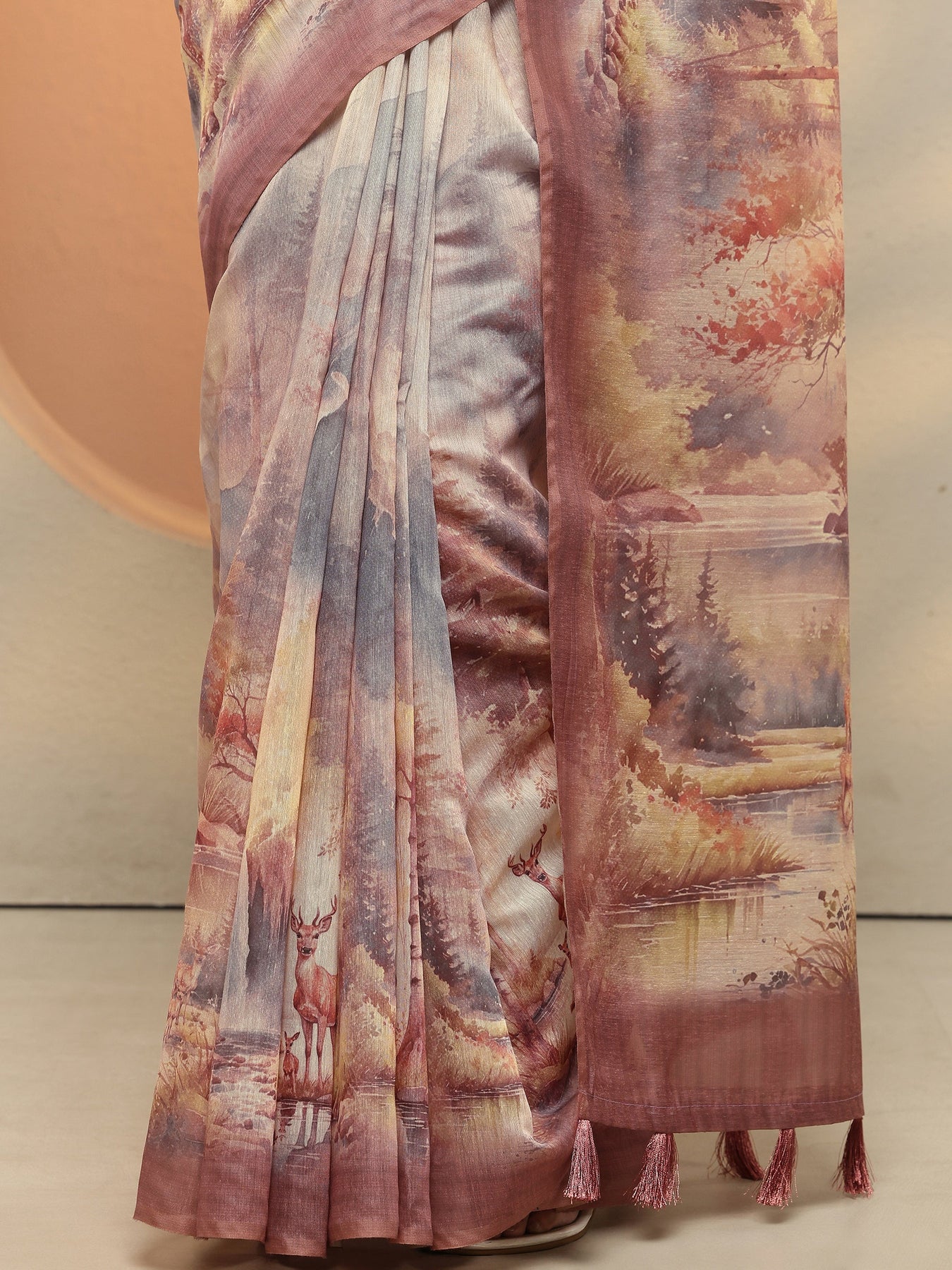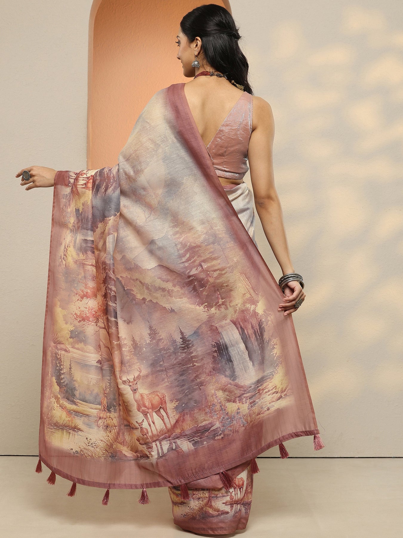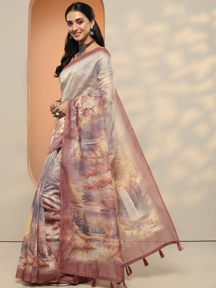 Our Multi Printed Silk Blend Saree Features Captivating Landscape Print. Complemented With A Blouse Piece. This Charming Saree Is Perfect For Festive Occasions.