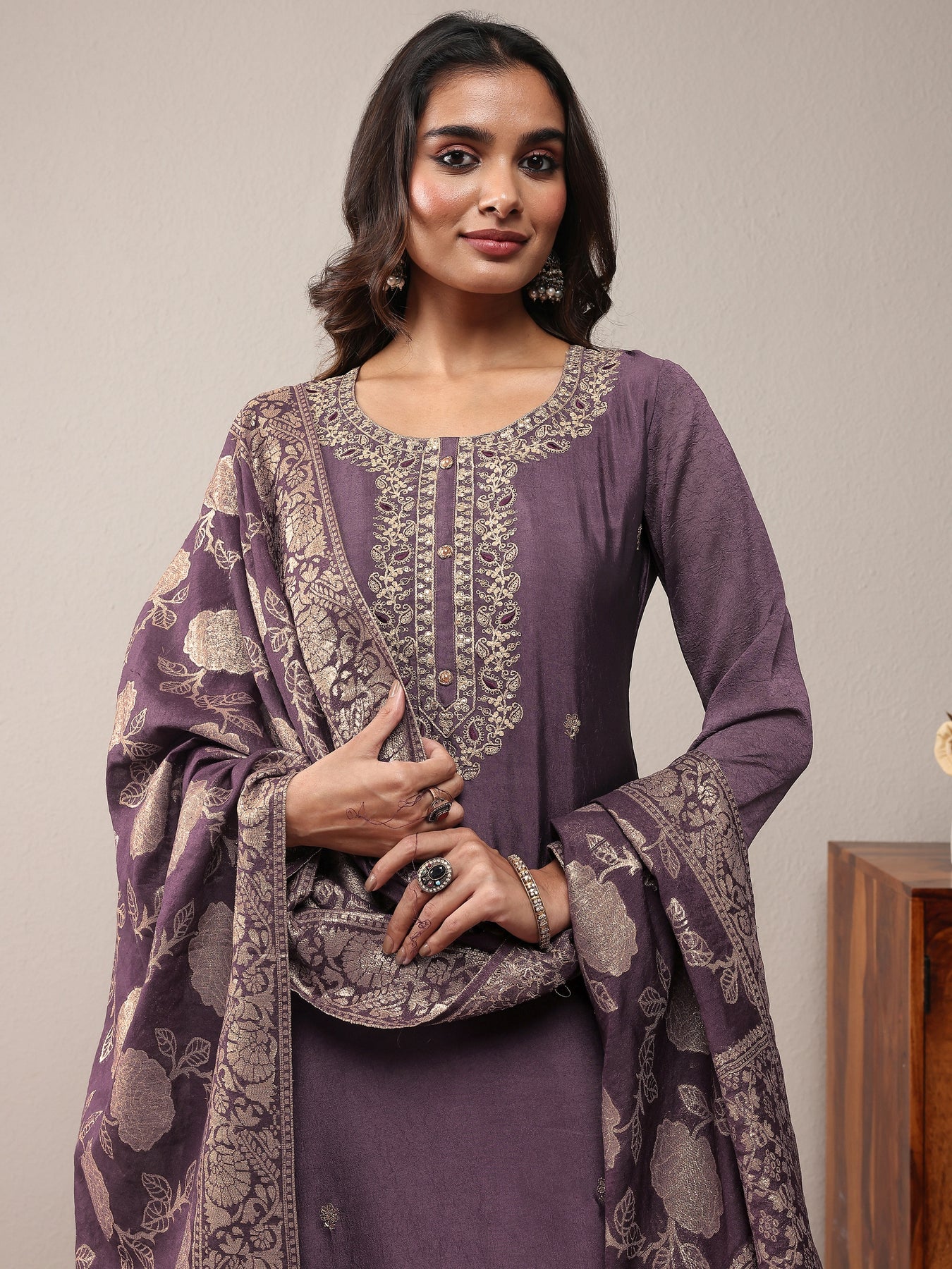 Purple Embroidered Silk Blend Straight Suit Set With Dupatta