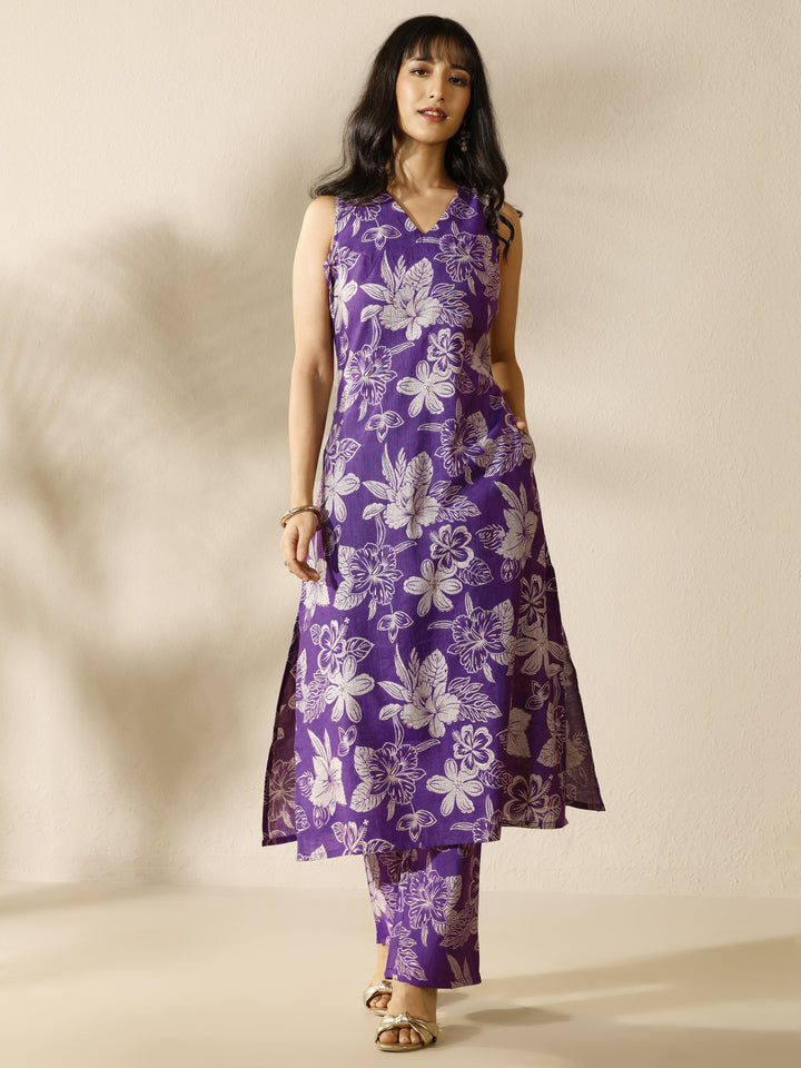 Our 2-piece Purple printed silk blend co-ord set features a straight-fit tunic with a V-neck neckline and sleeveless design. Complemented with matching trousers with a partially elasticated waistband and 2 pockets. Highlighted with top print, this style is perfect for festive occasions.