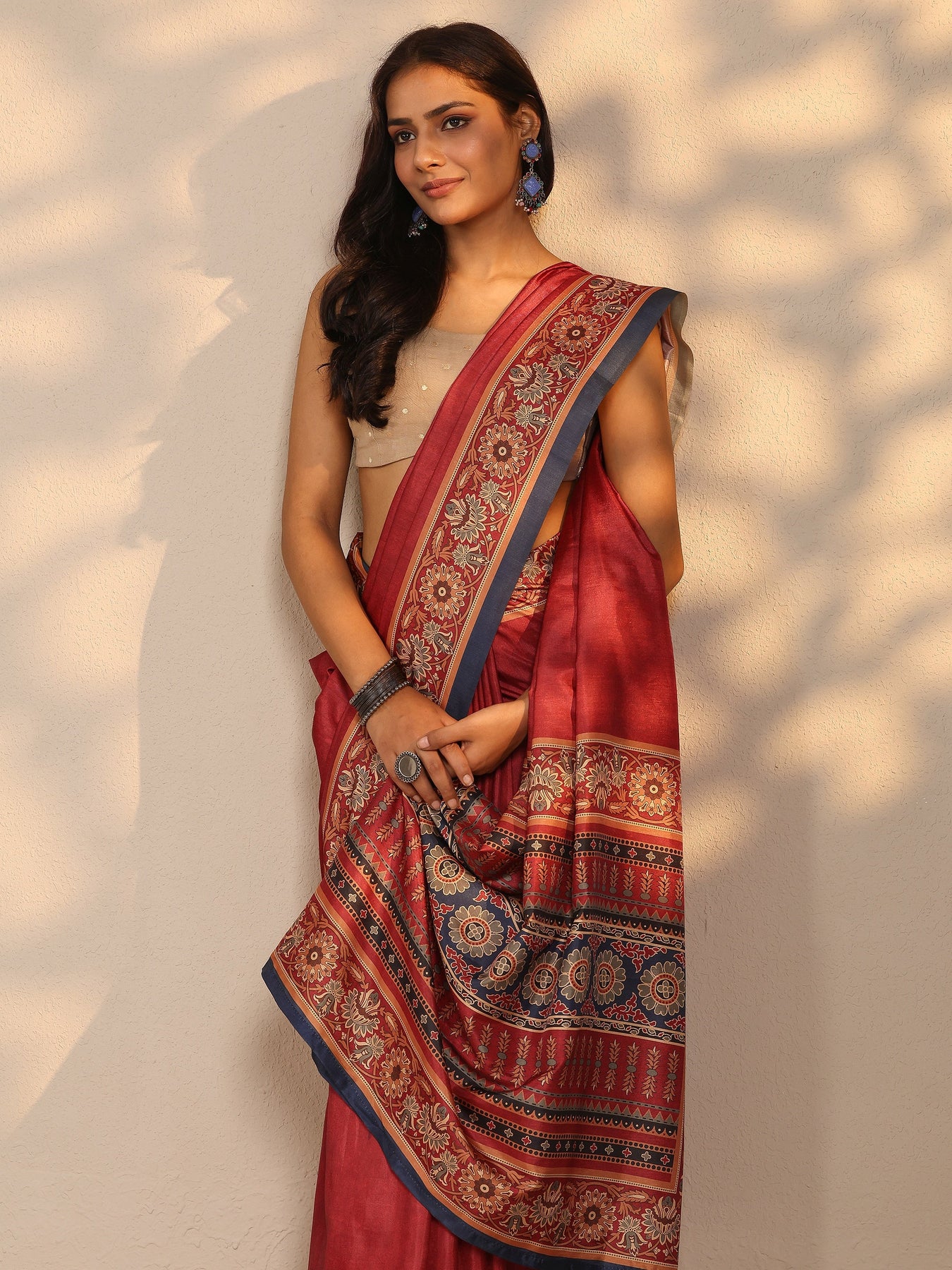 Our Red Printed Silk Blend Saree Features Captivating Floral Print. Complemented With A Blouse Piece. This Charming Saree Is Perfect For Festive Occasions.