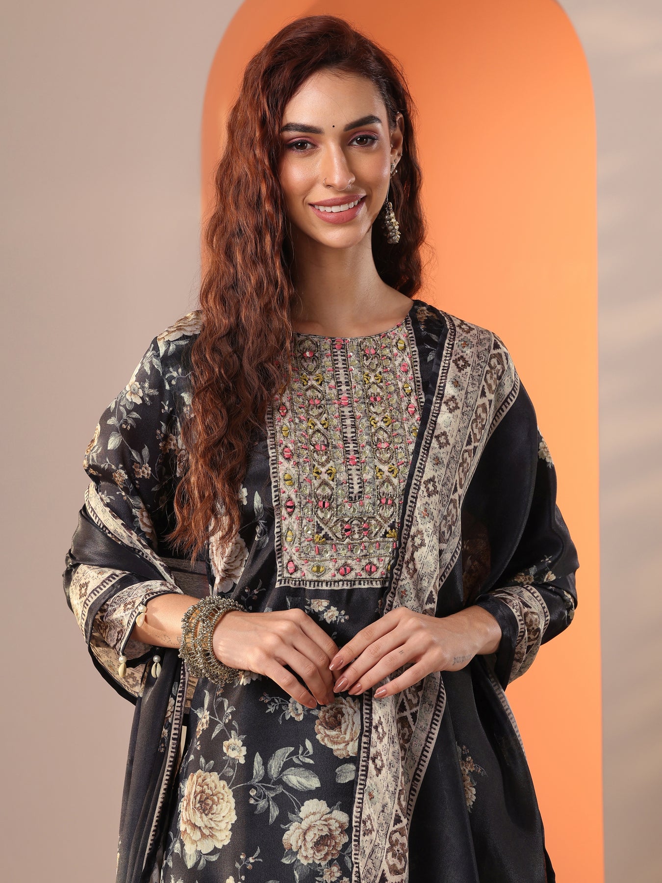 Libas Art Black Embellished Chinon Straight Suit Set With Dupatta
