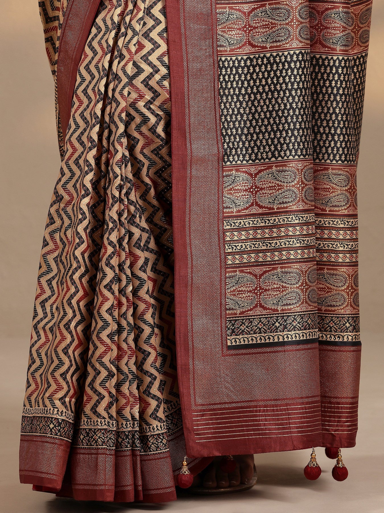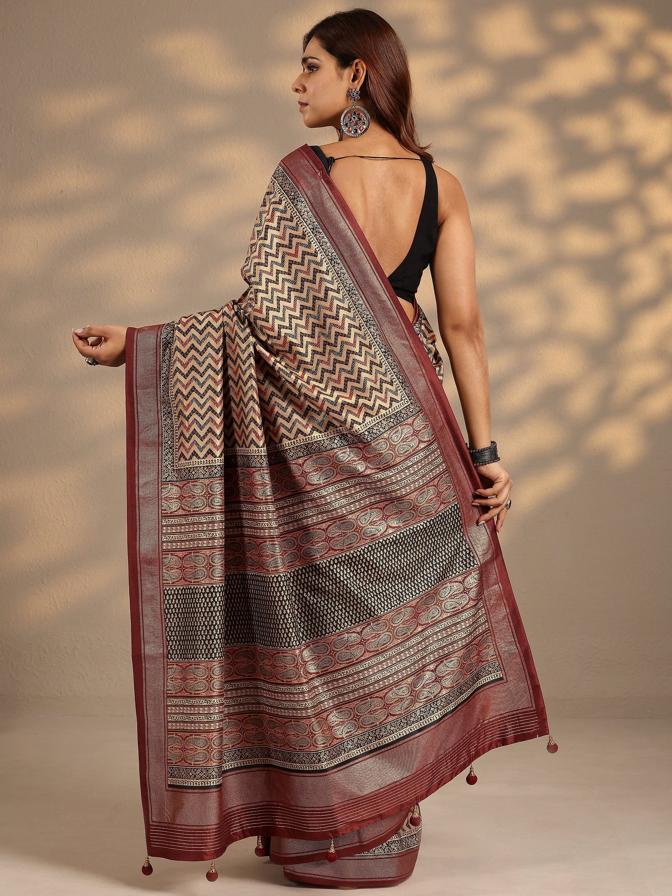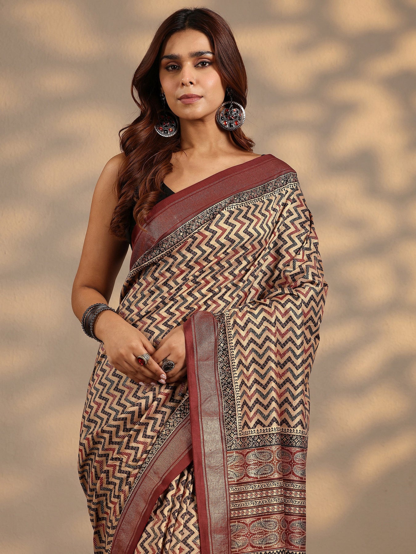 Beige Chevron Printed Silk Blend Saree With Unstitched Blouse Piece