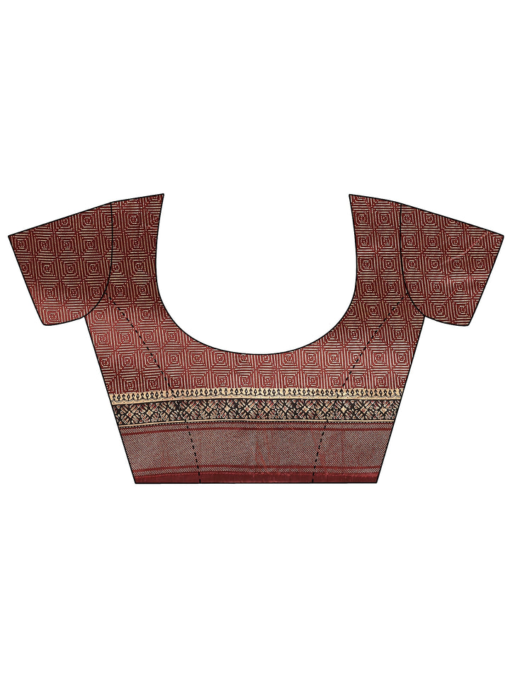 Our Maroon Printed Silk Blend Saree Features Captivating Geometric Print. Complemented With A Blouse Piece. This Charming Saree Is Perfect For Festive Occasions.
