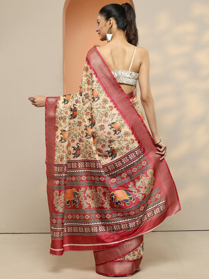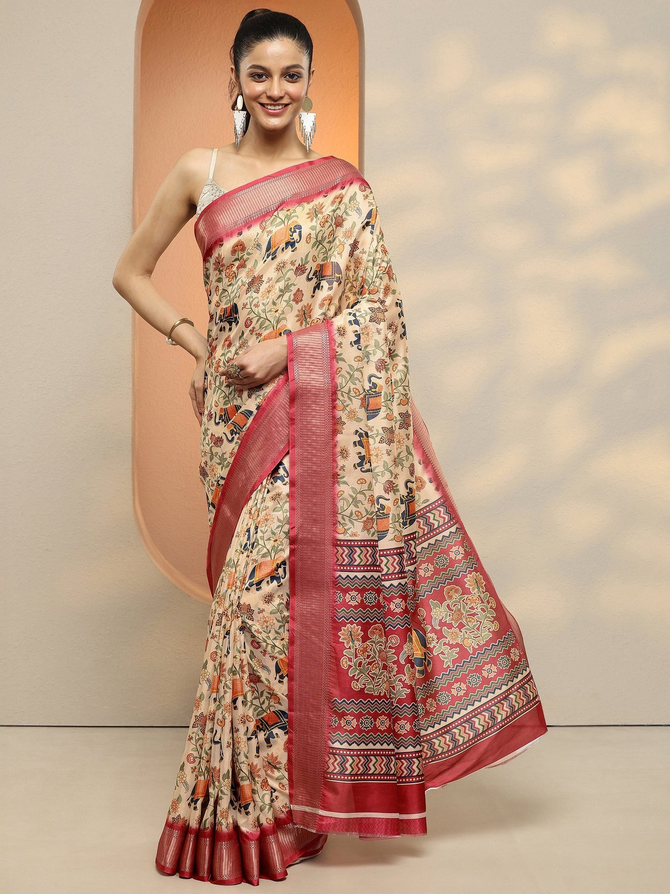 Our Cream Printed Silk Blend Saree Features Captivating Traditional Motifs. Complemented With A Blouse Piece. This Charming Saree Is Perfect For Festive Occasions.