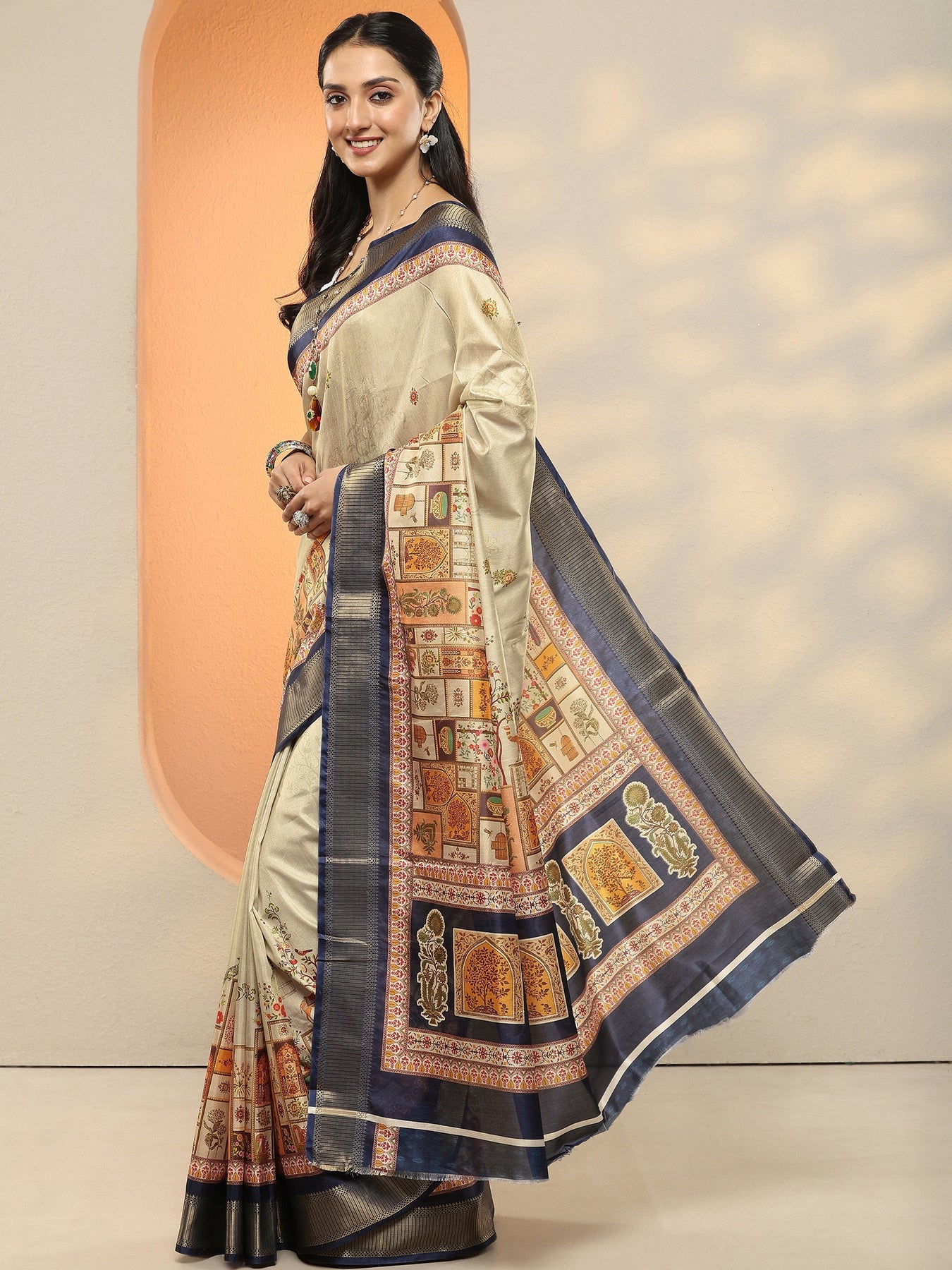 Beige Printed Silk Blend Saree With Unstitched Blouse Piece