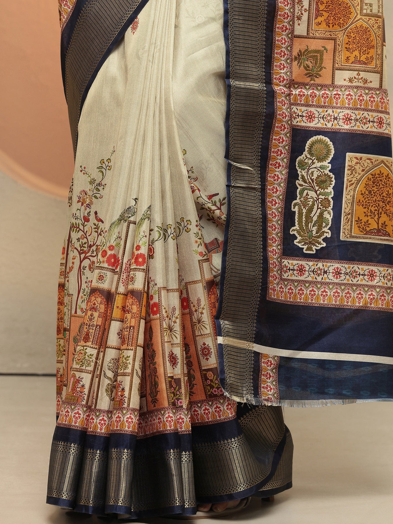 Our Off White Printed Silk Blend Saree Features Captivating Traditional Print. Complemented With A Blouse Piece. This Charming Saree Is Perfect For Festive Occasions.