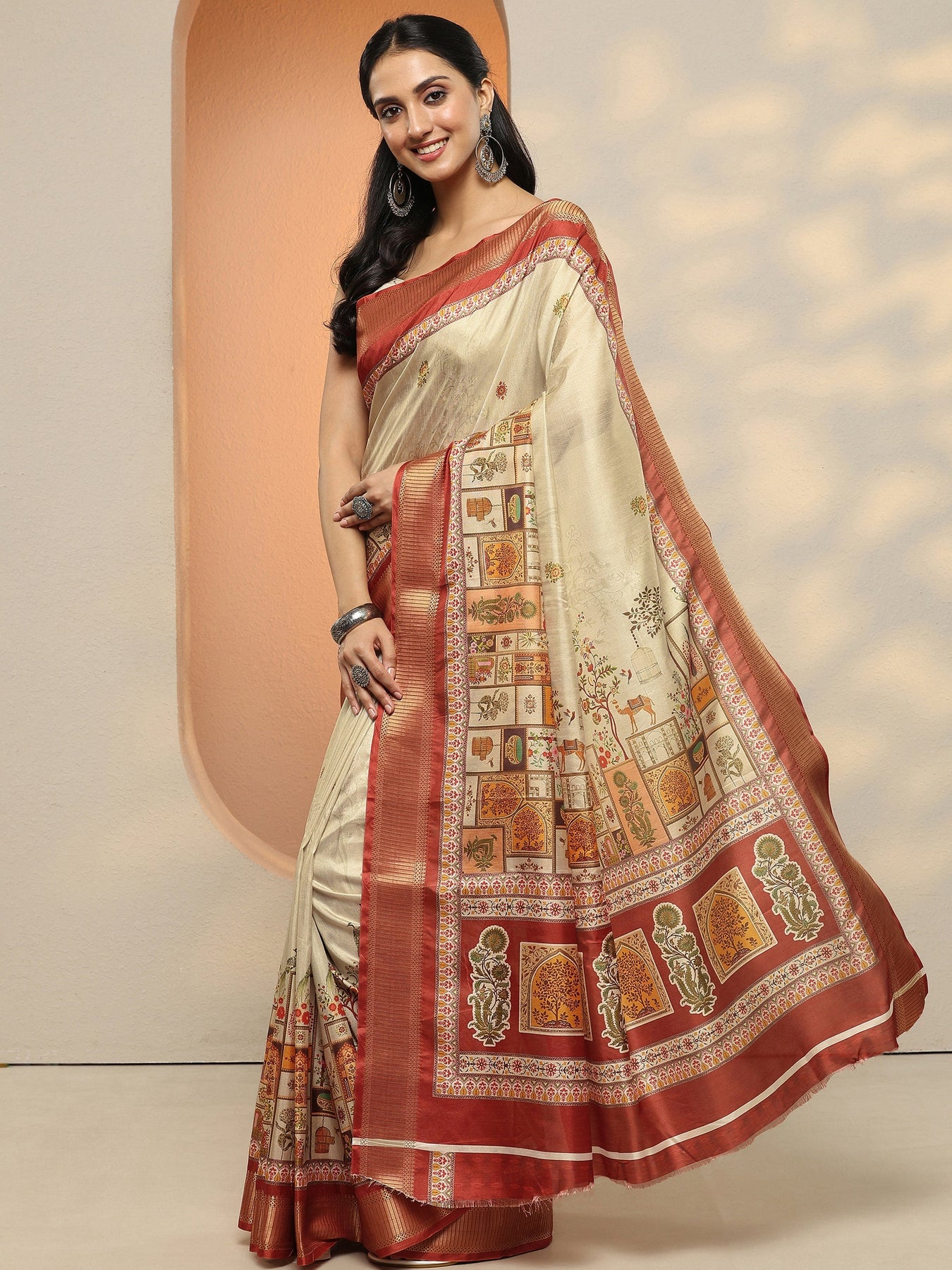 Our Cream Printed Silk Blend Saree Features Captivating Top Print. Complemented With A Blouse Piece. This Charming Saree Is Perfect For Occasion.