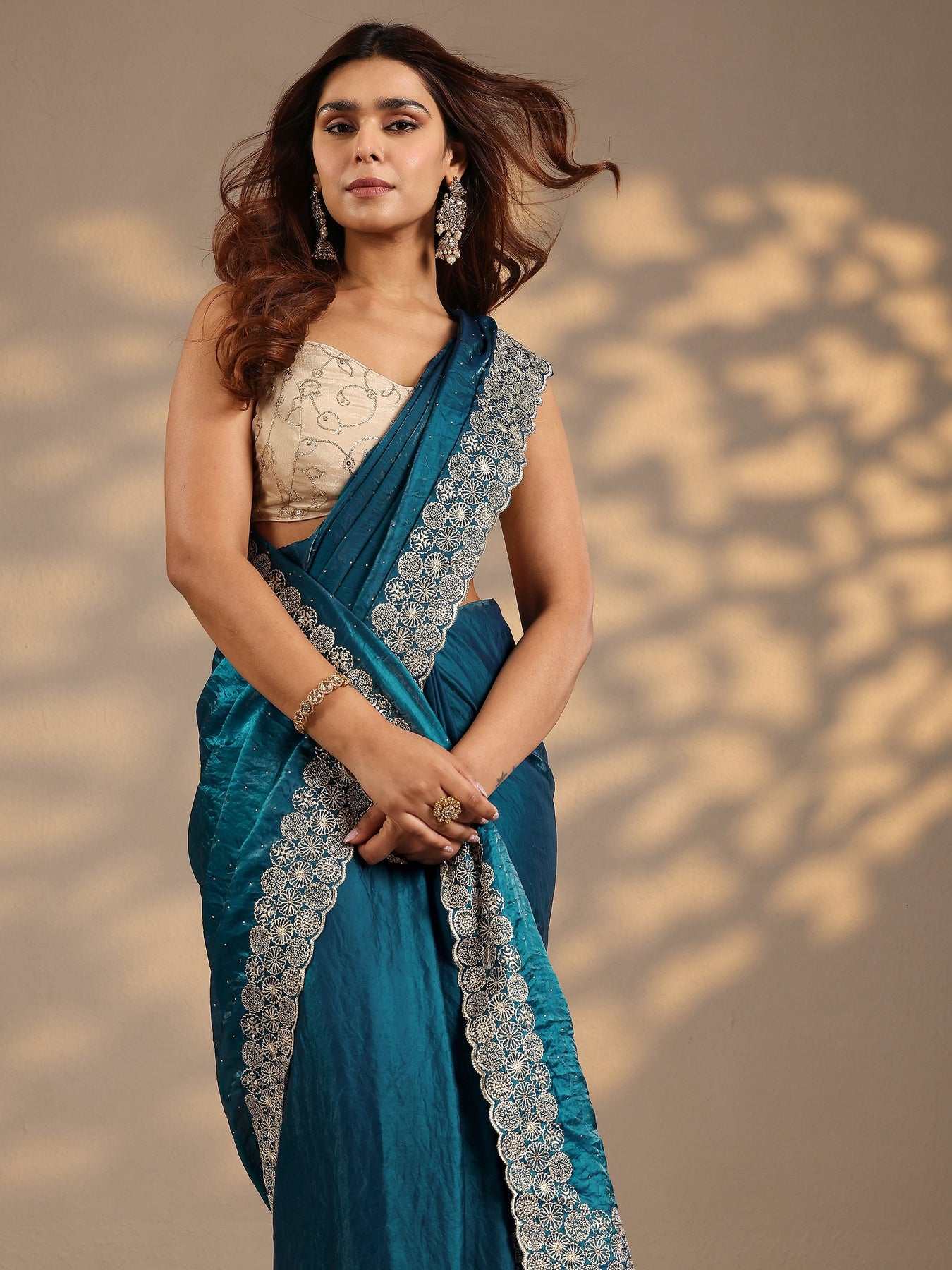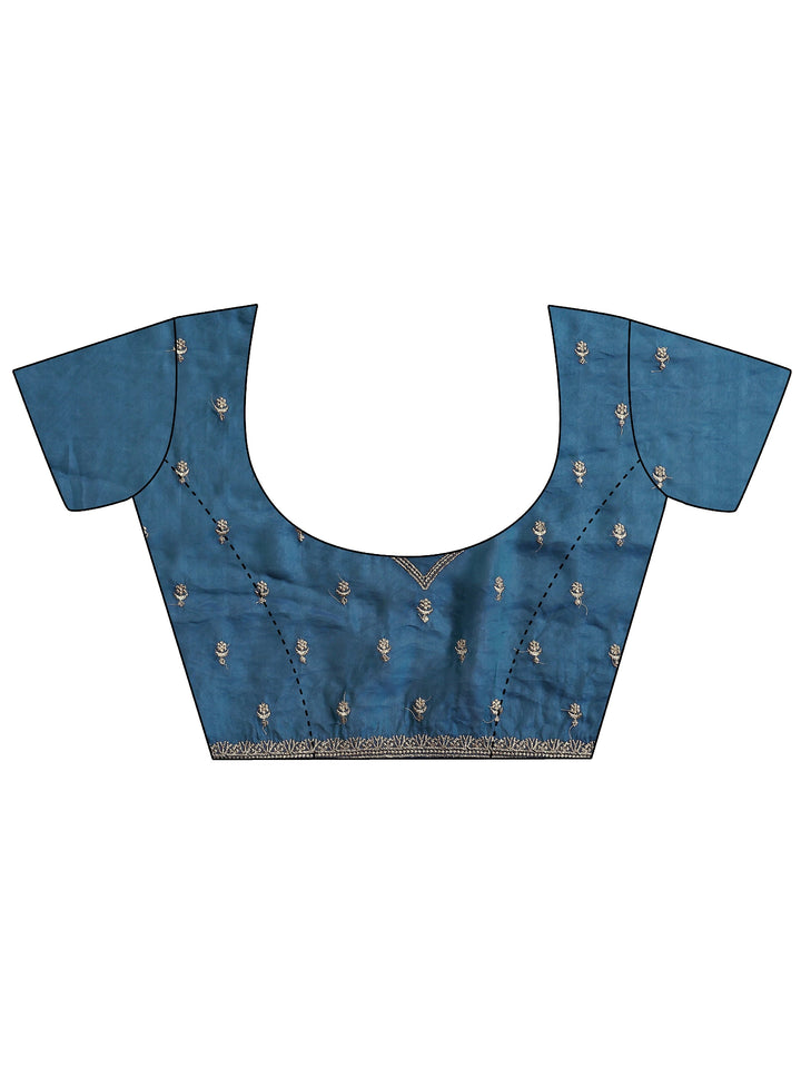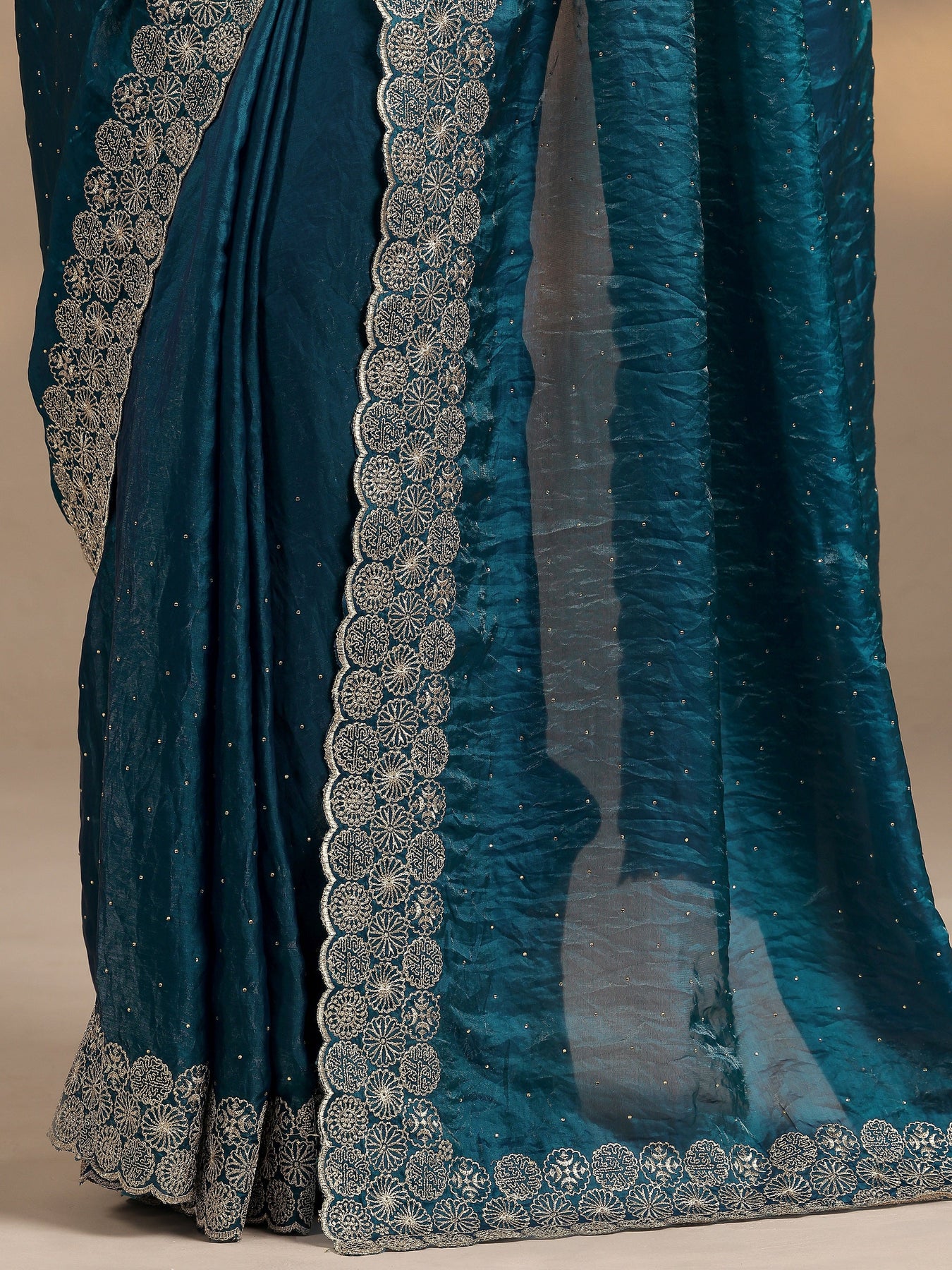 Our Teal Printed Silk Blend Saree Features Captivating Embroidered Embellishments. Complemented With A Blouse Piece. This Charming Saree Is Perfect For Festive Occasions.