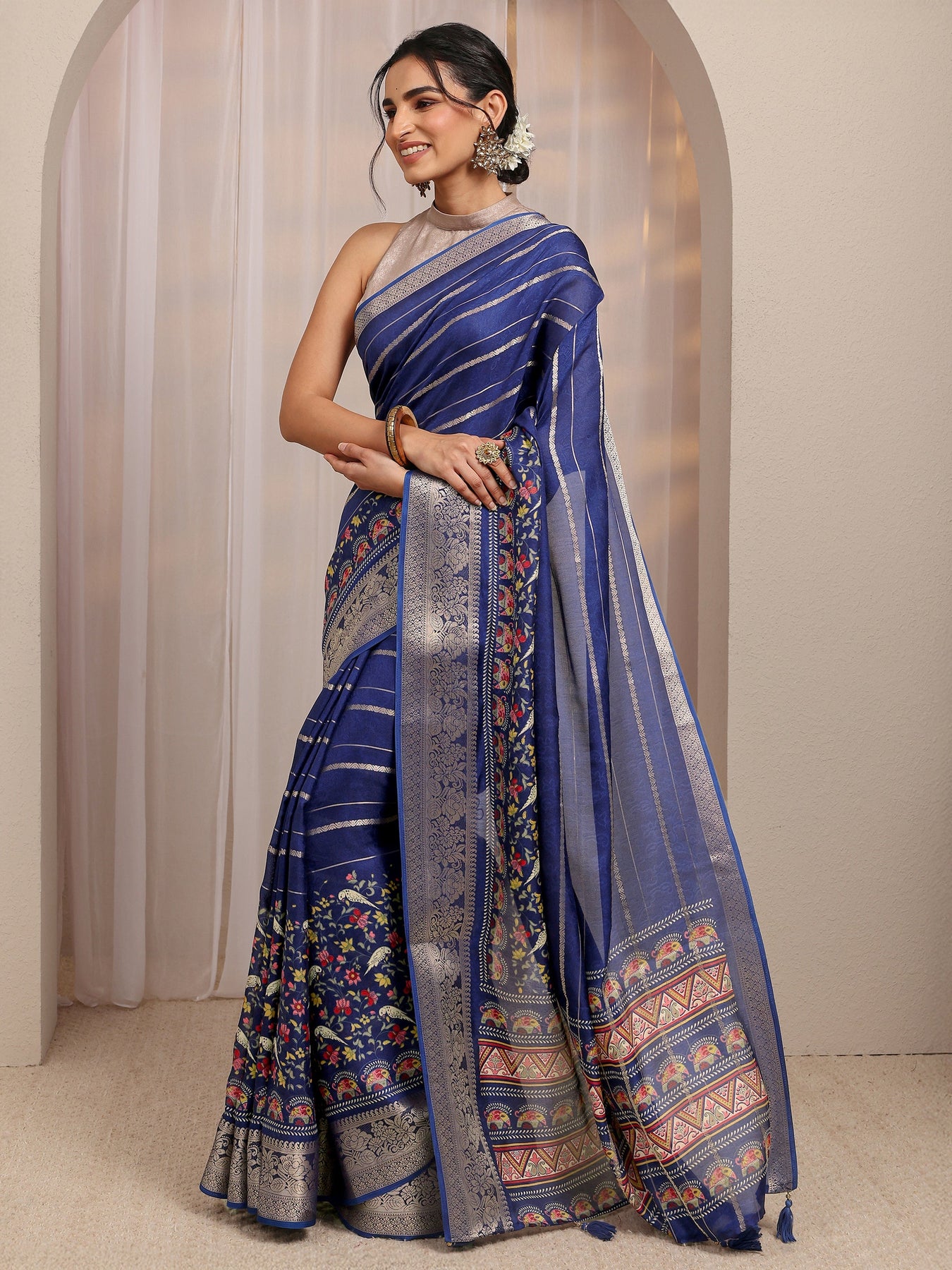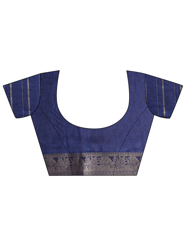 Our Navy Blue printed Silk blend saree features a captivating floral design inspired by Baluchari sarees. Complemented with a Stitched Unstitched blouse . This charming saree is perfect for festive occasions.