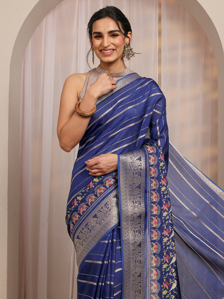 Blue Floral Woven Design Silk Blend Saree With Unstitched Blouse Piece