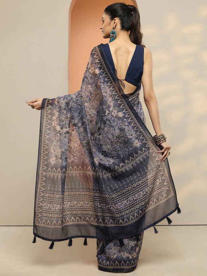 Our Navy Blue Printed Silk Blend Saree Features Captivating Floral Print. Complemented With A Stitched Blouse. This Charming Saree Is Perfect For Festive Occasions.