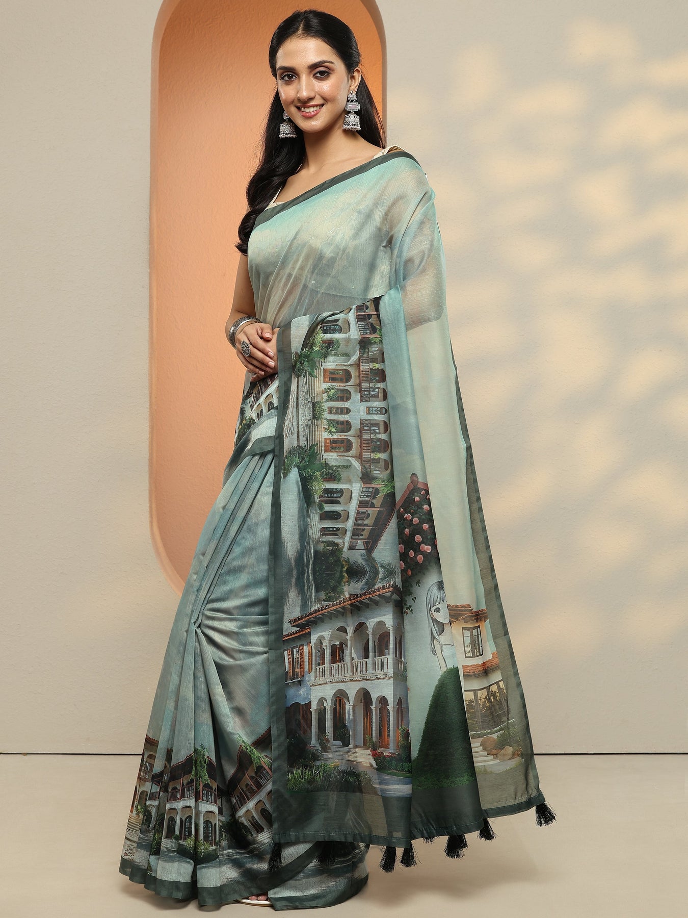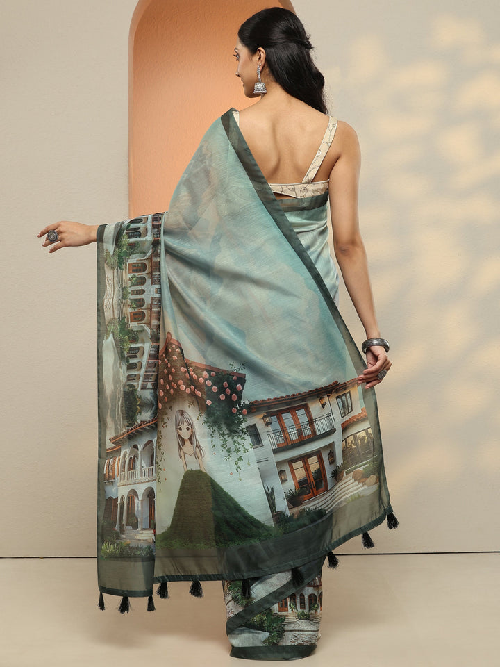 Our Sea Green Printed Silk Blend Saree Features Captivating Architectural Print. Complemented With A Blouse Piece. This Charming Saree Is Perfect For Festive Occasions.