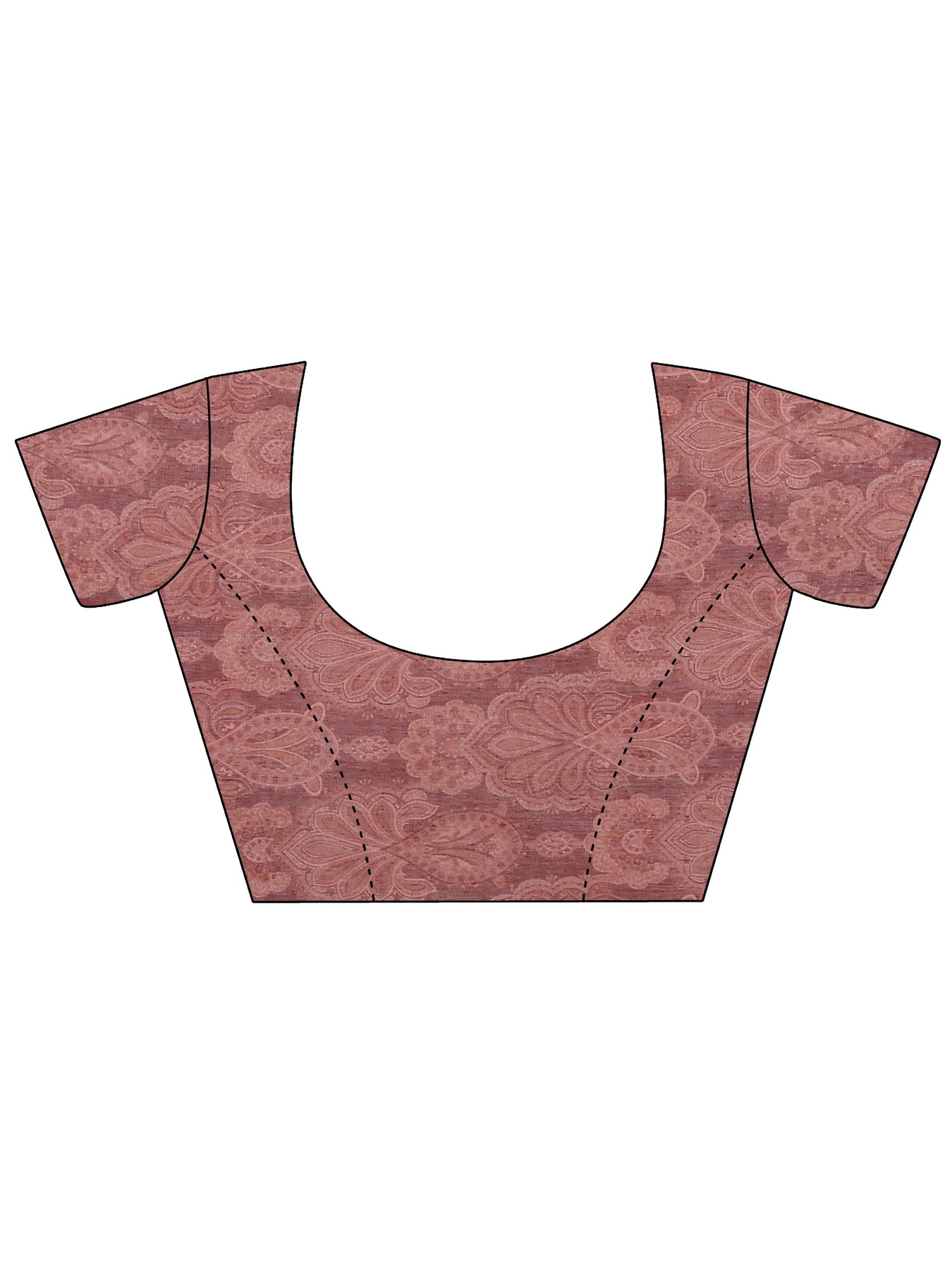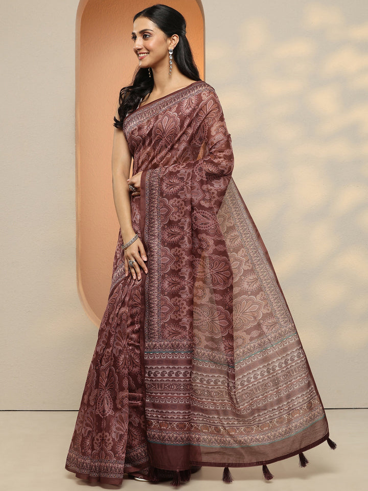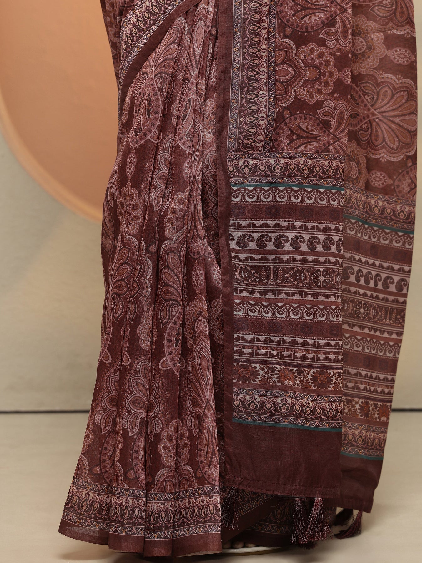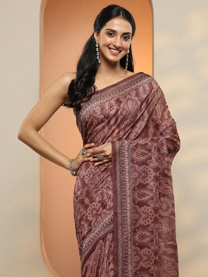 Brown Printed Silk Blend Saree With Unstitched Blouse Piece