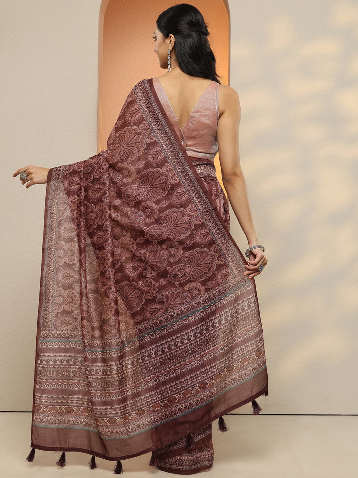 Our Brown Printed Silk Blend Saree Features Captivating Floral Print. Complemented With A Blouse Piece. This Charming Saree Is Perfect For Festive Occasions.