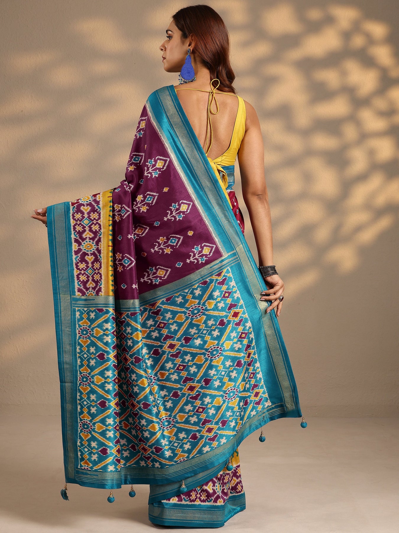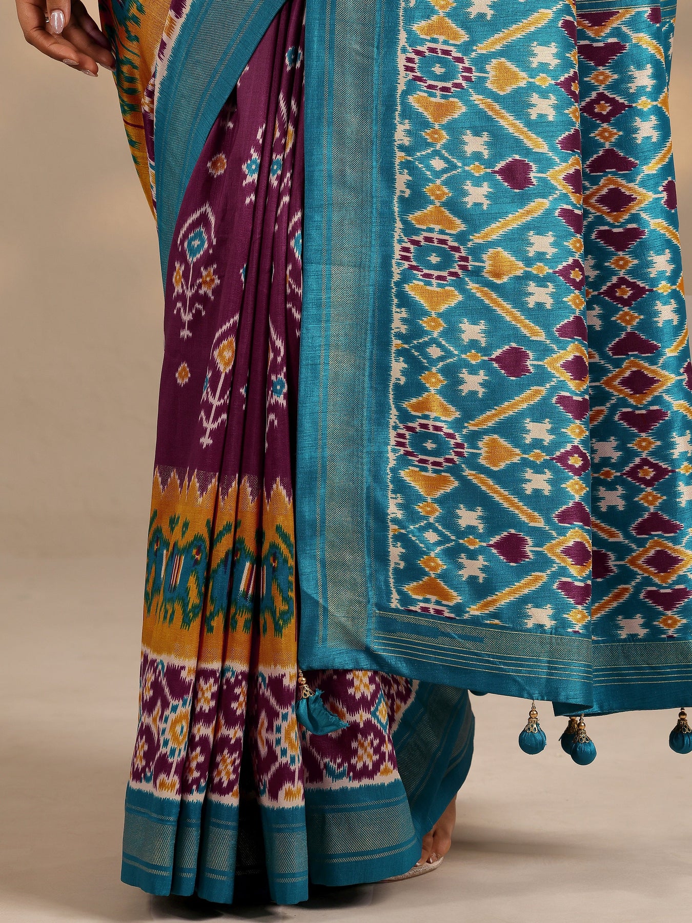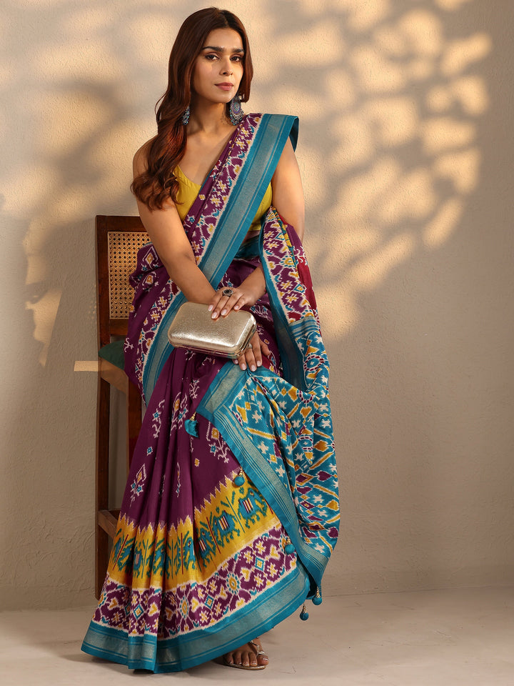 Our Purple Printed Silk Blend Saree Features Captivating Top Pattern Print. Complemented With A Blouse Piece. This Charming Saree Is Perfect For Festive Occasions.