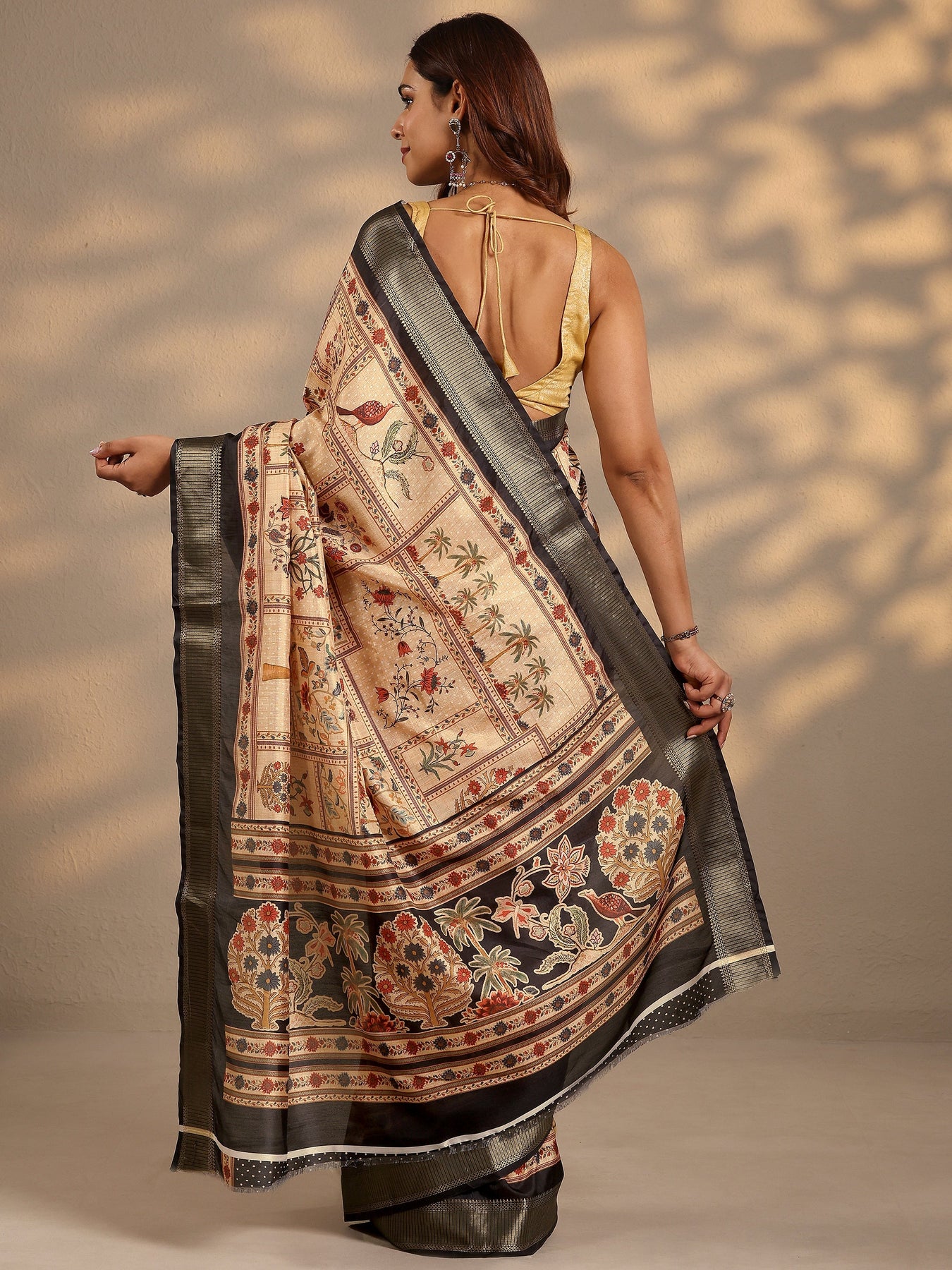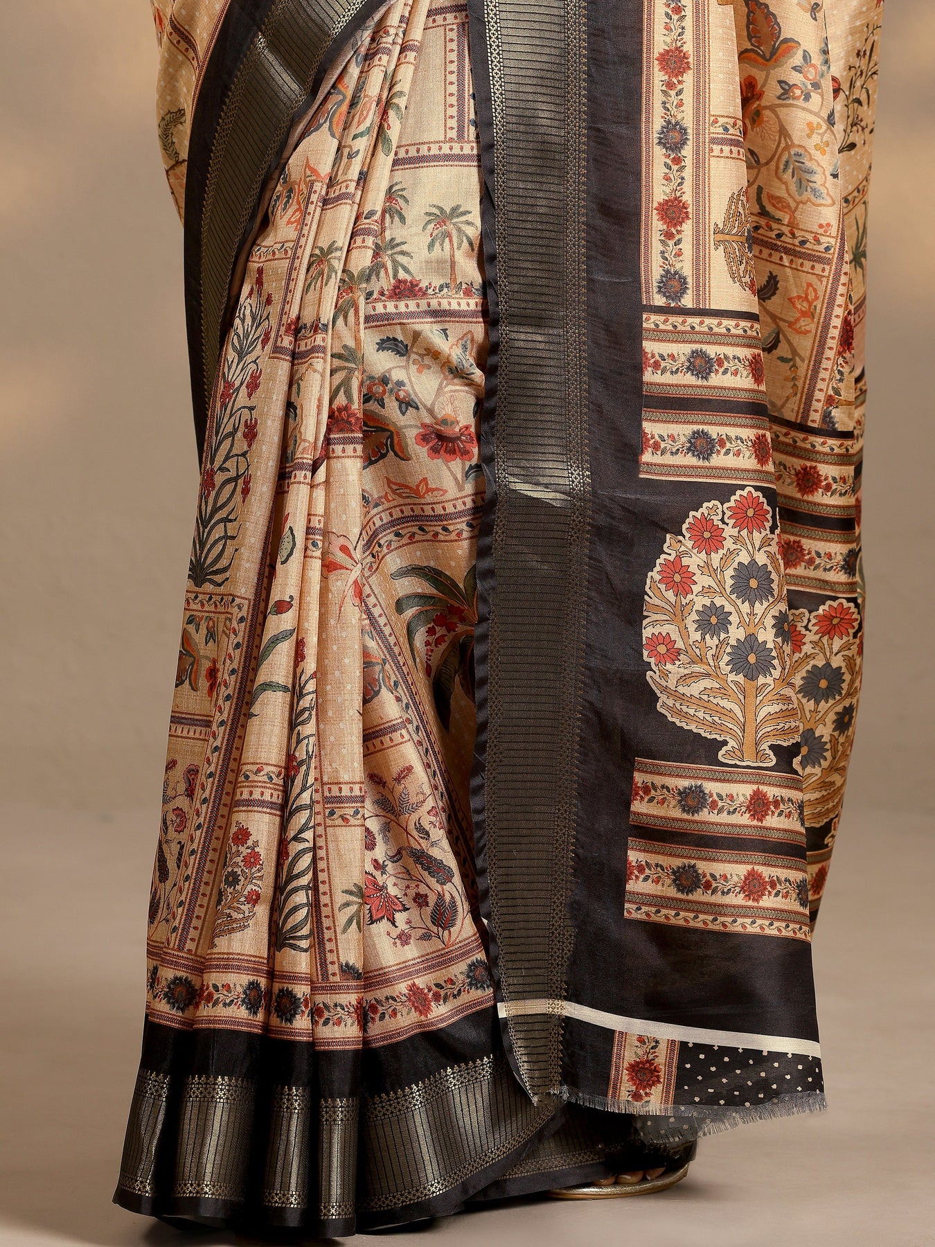 Our Beige Printed Silk Blend Saree Features Captivating Floral Print. Complemented With A Blouse Piece. This Charming Saree Is Perfect For Festive Occasions.