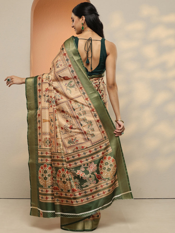 Our Green Printed Silk Blend Saree Features Captivating Floral Print. Complemented With A Blouse Piece. This Charming Saree Is Perfect For Festive Occasions.