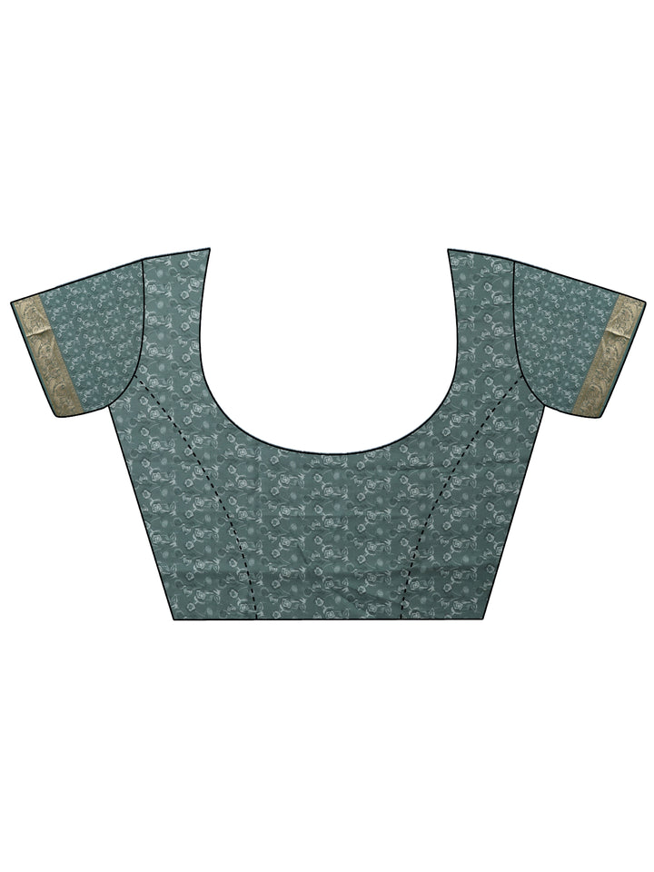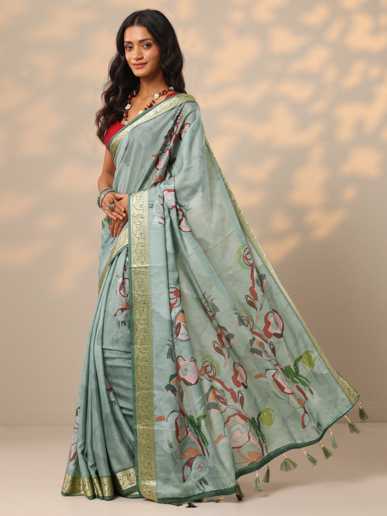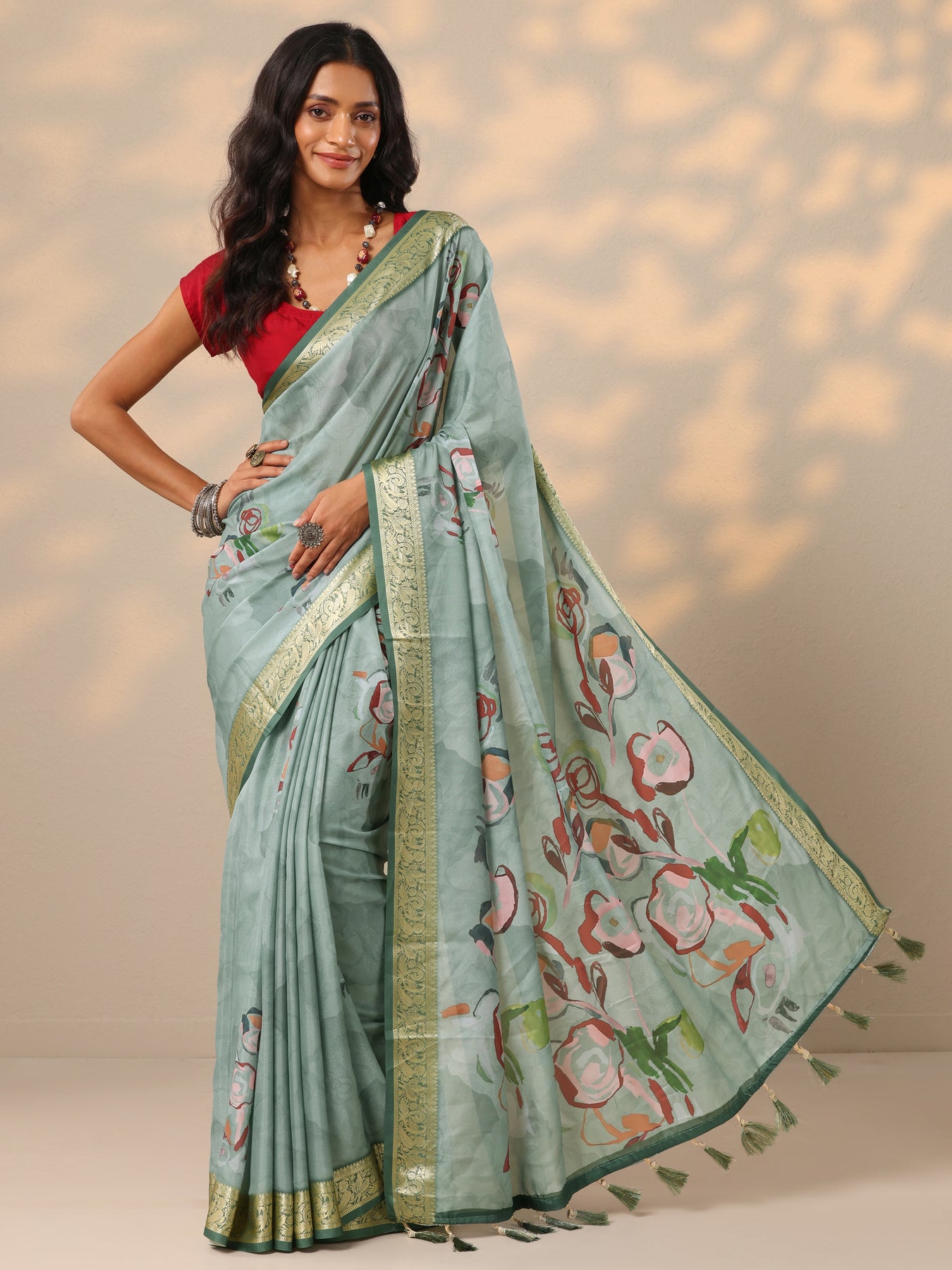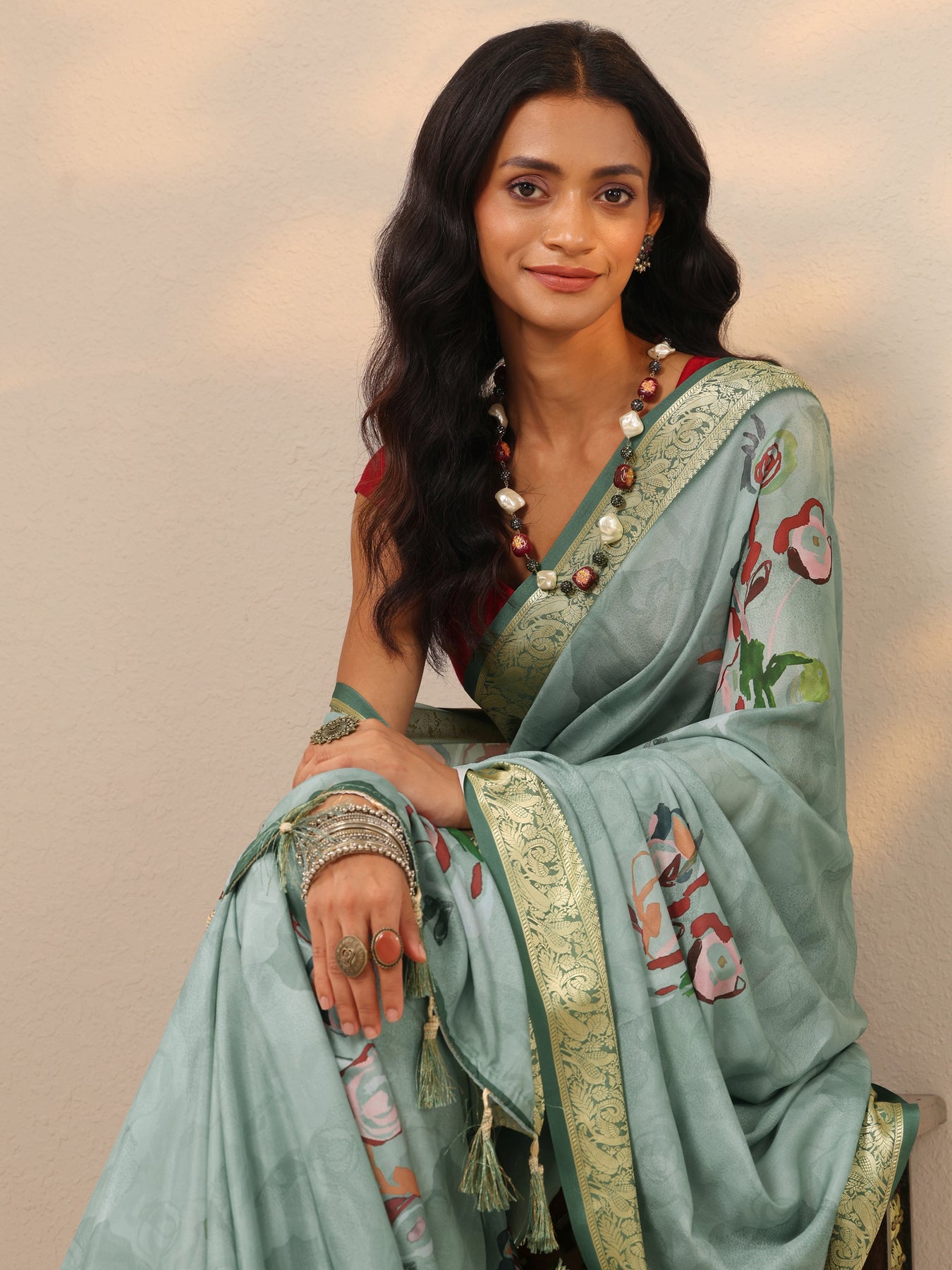 Our Sea Green printed Crepe saree features captivating floral print. Complemented with a unstitched blouse Piece. This charming saree is perfect for festive occasions