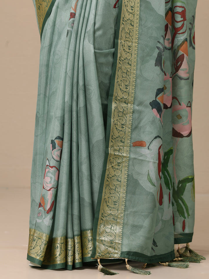 Green Printed Crepe Saree With Unstitched Blouse Piece