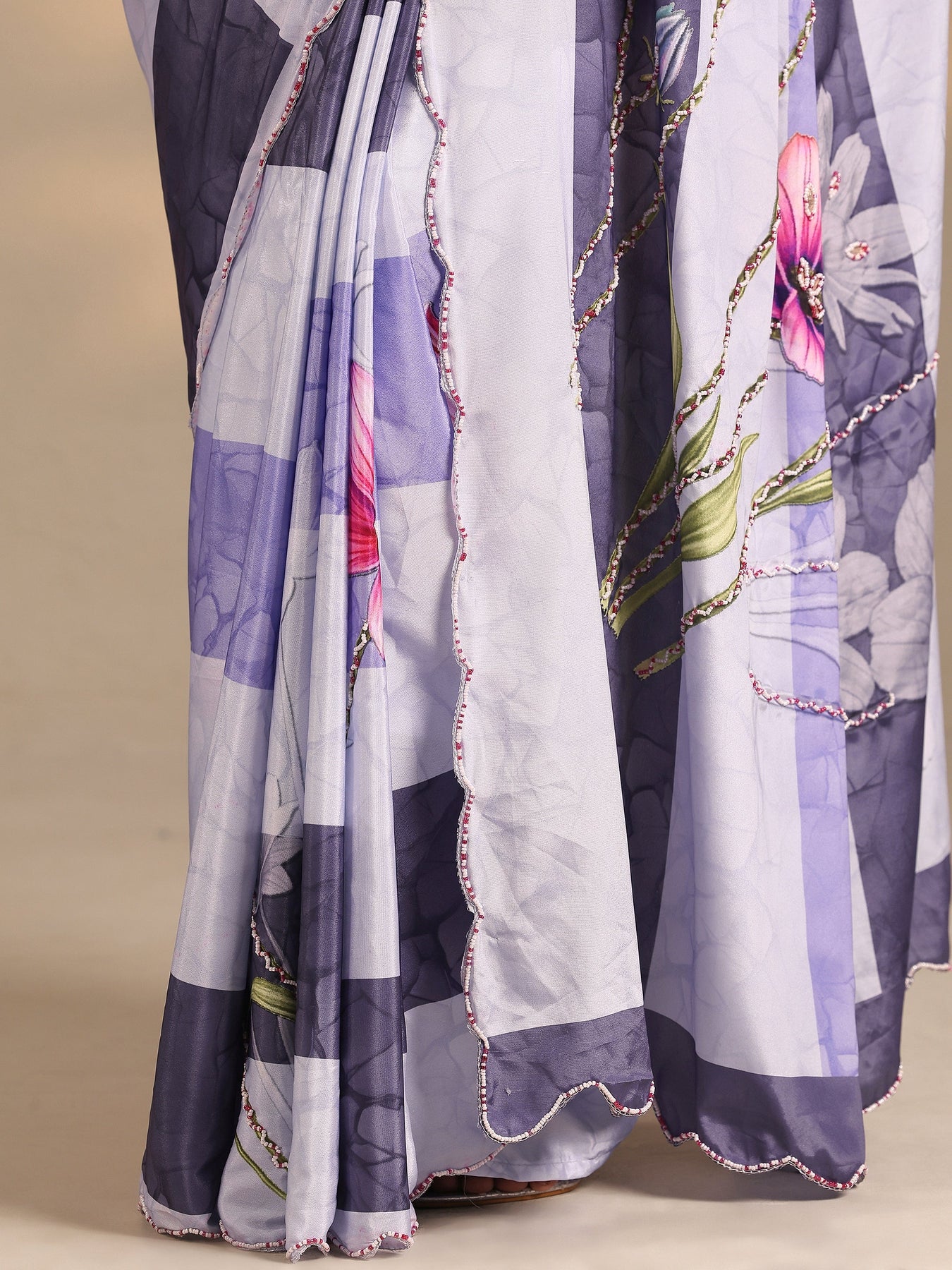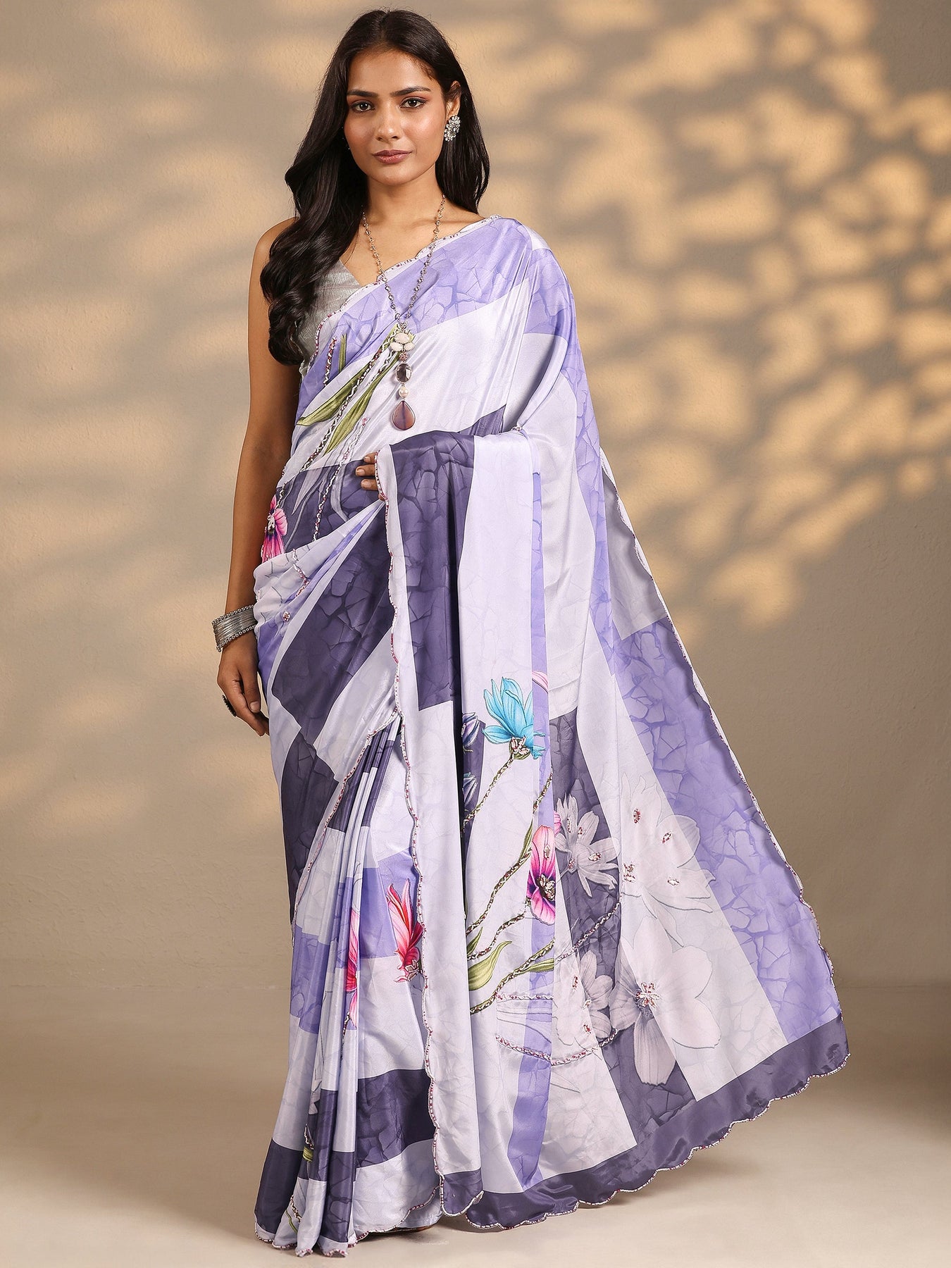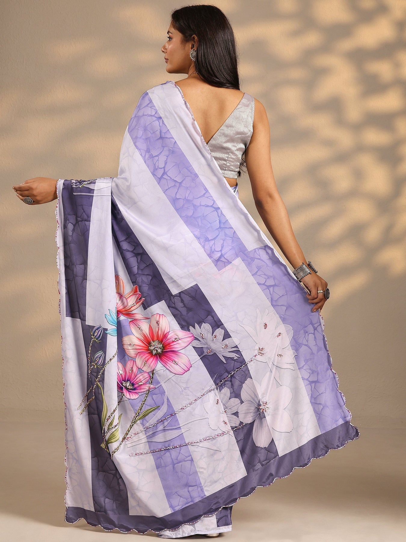 Our Lavender Printed Silk Blend Saree Features Captivating Floral Print. Complemented With A Blouse Piece. This Charming Saree Is Perfect For Festive Occasions.