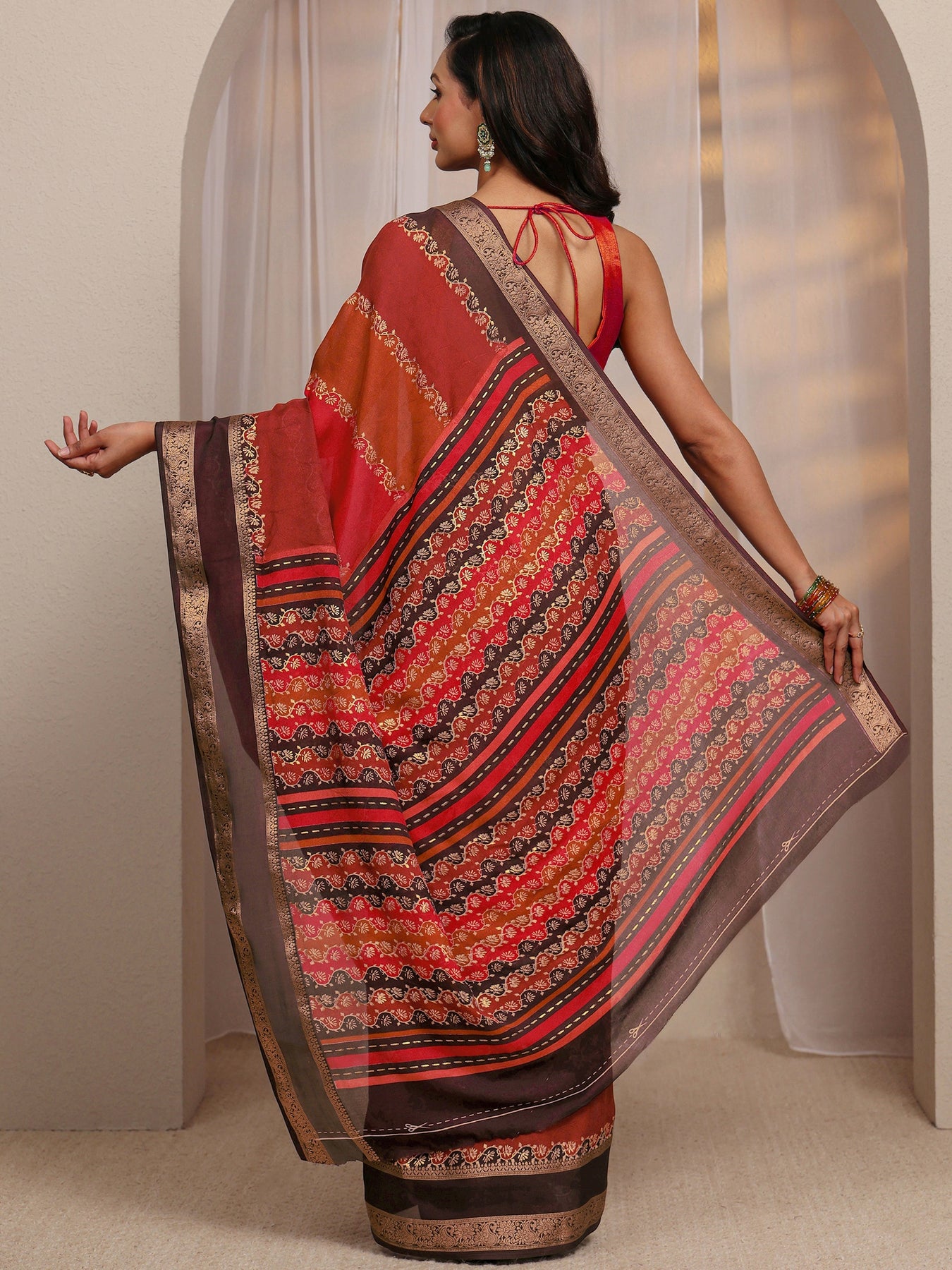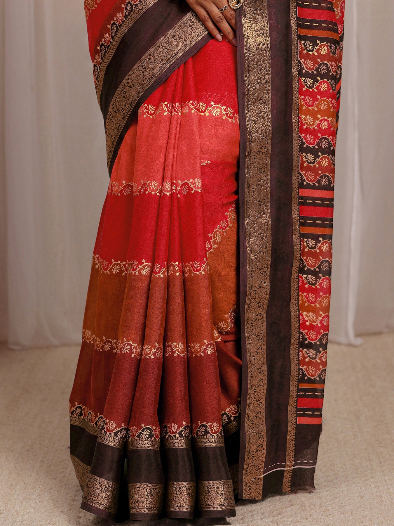 Our red printed silk blend saree features a captivating woven design inspired by the rich craft of Banarasi weaves. Complemented with a Unstitched blouse piece. This charming saree is perfect for festive occasions.