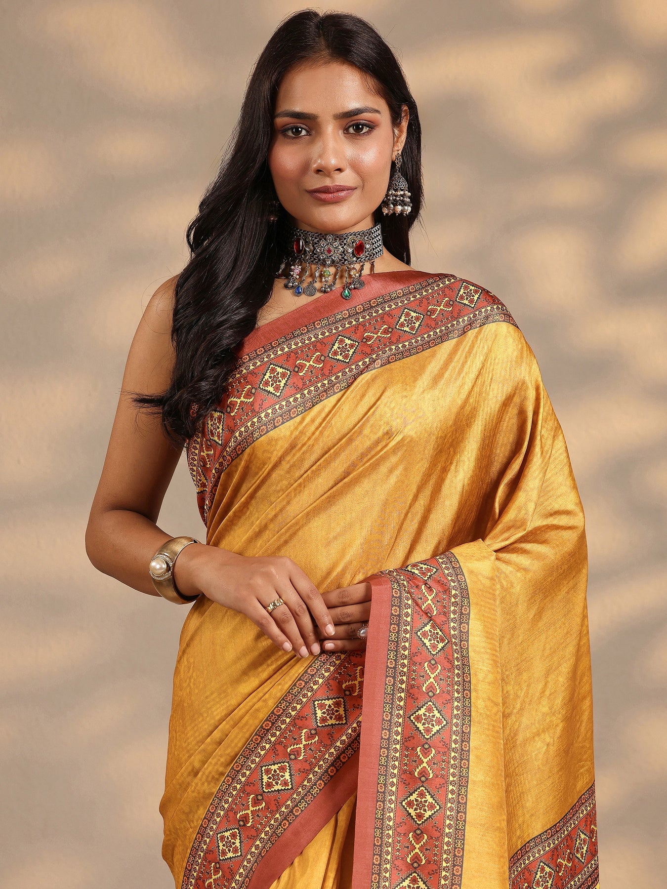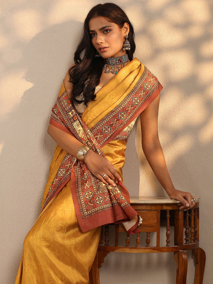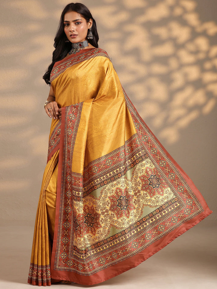 Our Mustard Printed Silk Blend Saree Features Captivating Traditional Print. Complemented With A Blouse Piece. This Charming Saree Is Perfect For Festive Occasions.