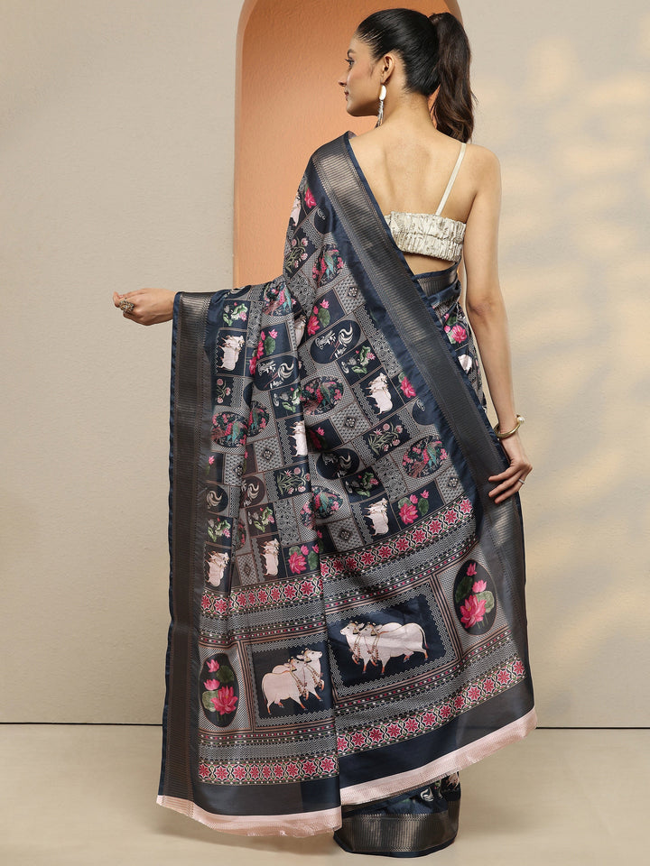 Our Grey Printed Silk Blend Saree Features Captivating Floral And Animal Motifs. Complemented With A Blouse Piece. This Charming Saree Is Perfect For Festive Occasions.