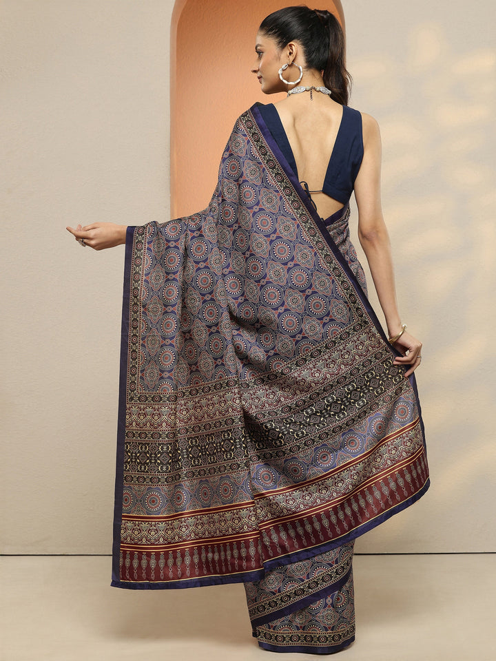 Navy Blue Printed Silk Blend Saree With Unstitched Blouse Piece
