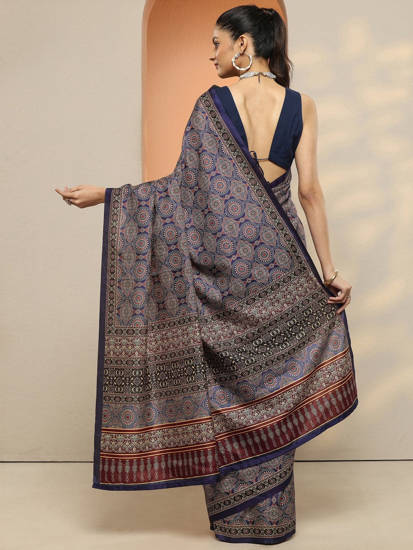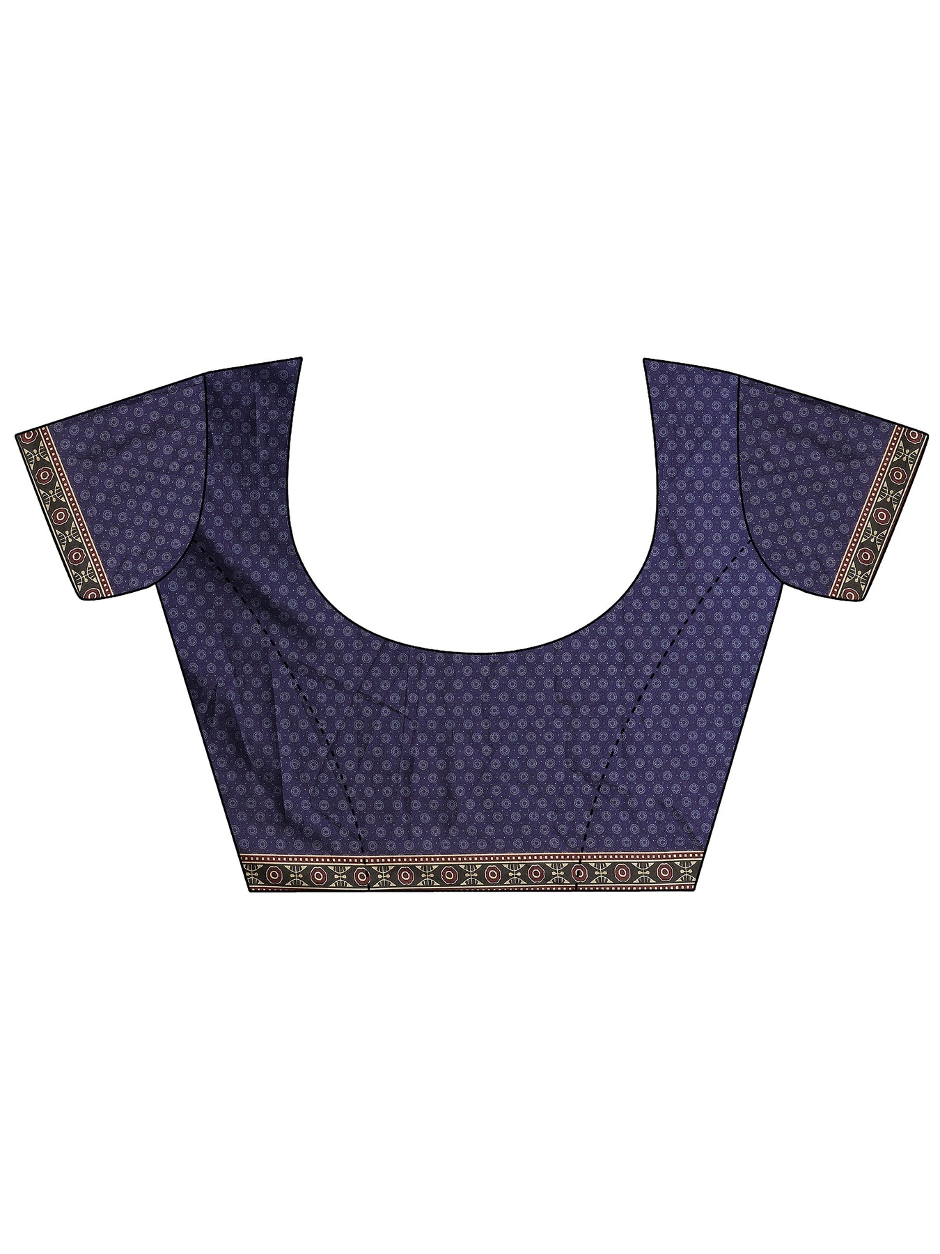 Our Navy Blue Printed Silk Blend Saree Features Captivating Geometric Print. Complemented With A Blouse Piece. This Charming Saree Is Perfect For Festive Occasions.