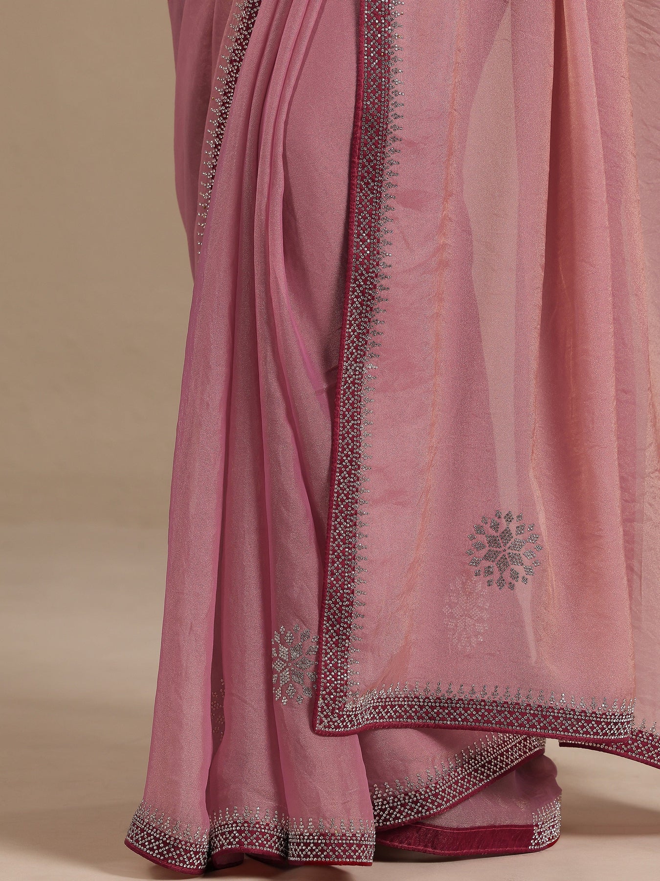 Our Pink Printed Organza Saree Features Captivating Floral Print. Complemented With A Blouse Piece. This Charming Saree Is Perfect For Festive Occasions.