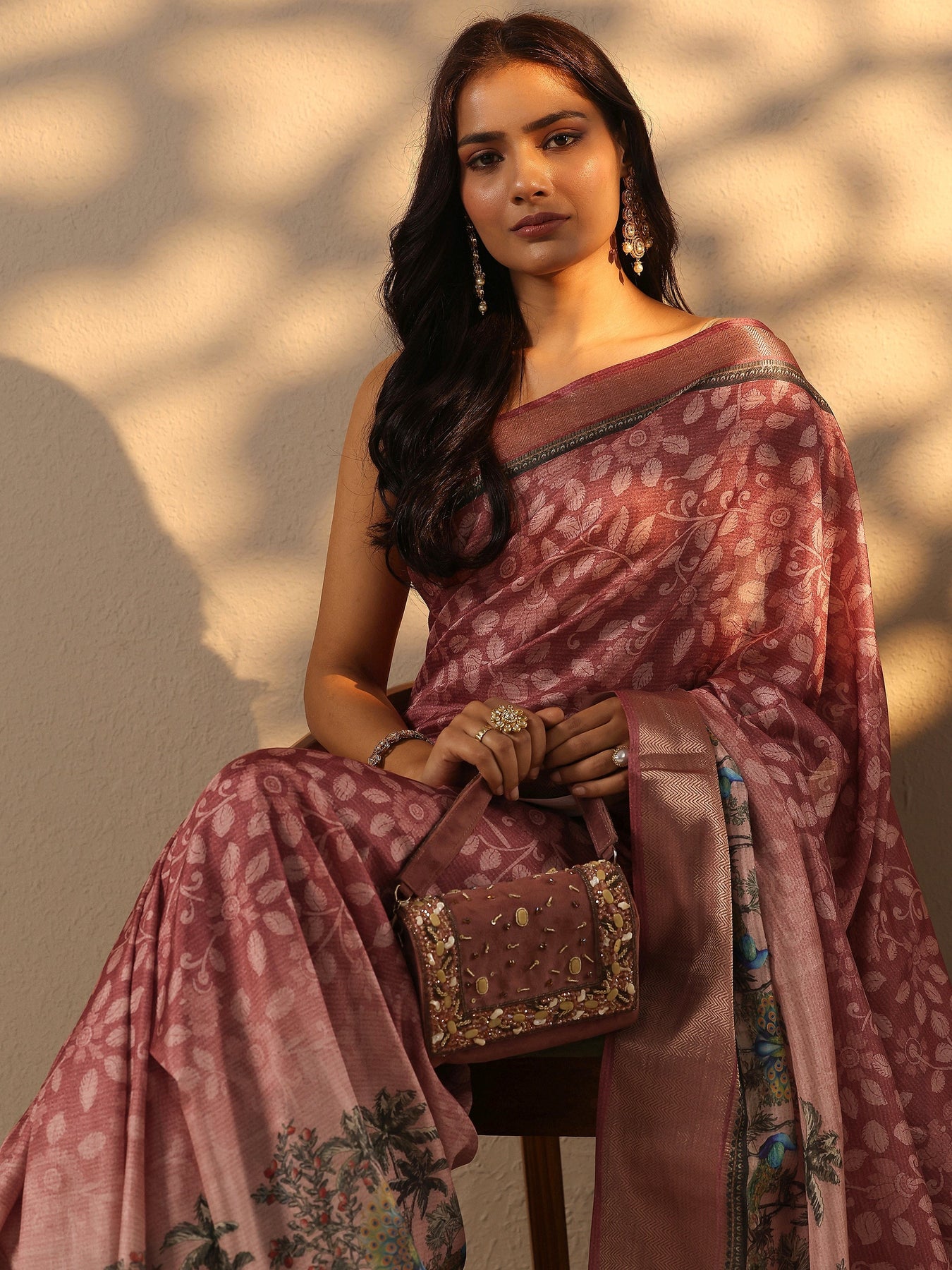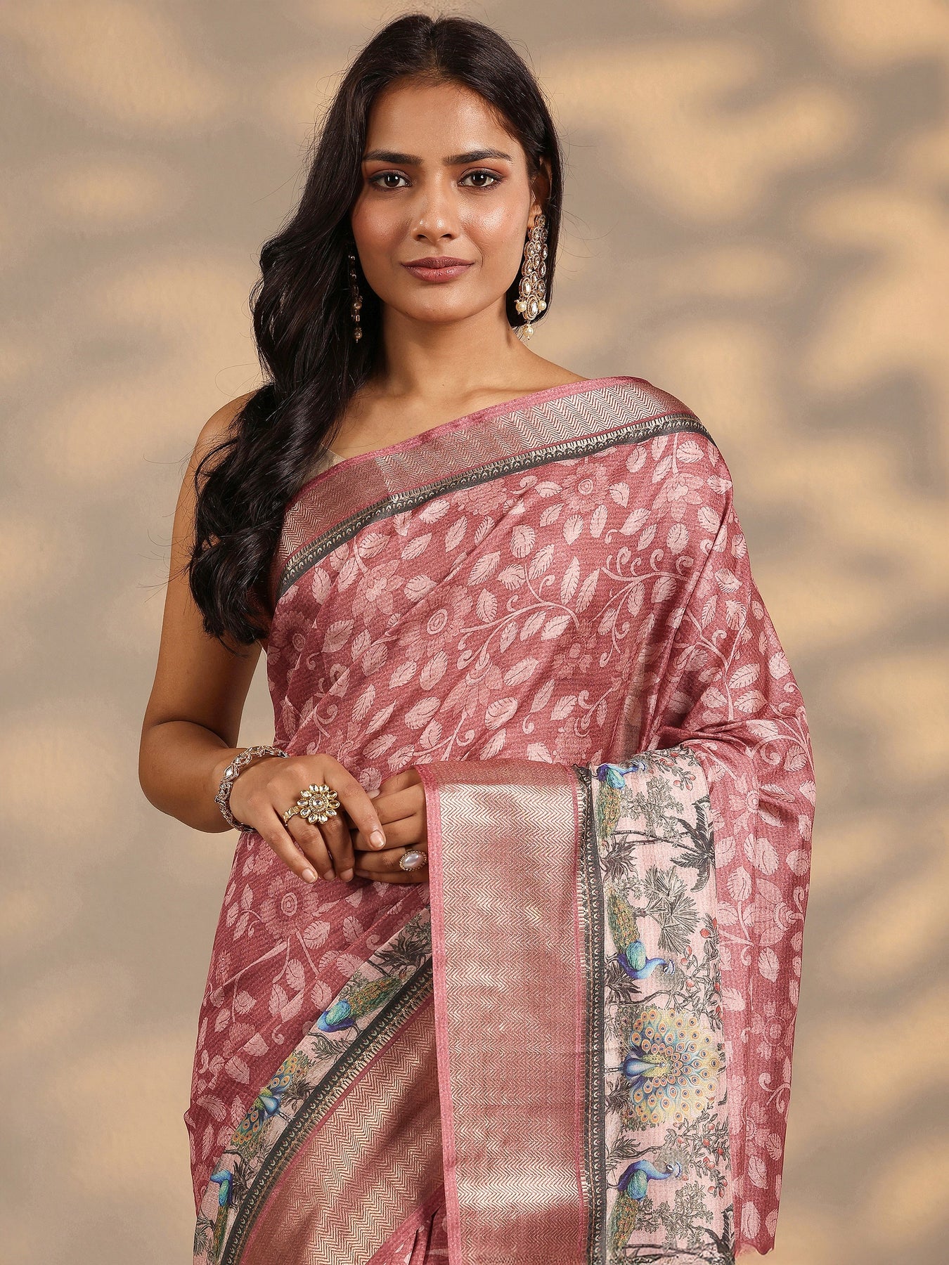 Our Pink Printed Silk Blend Saree Features Captivating Floral Print. Complemented With A Blouse Piece. This Charming Saree Is Perfect For Festive Occasions.