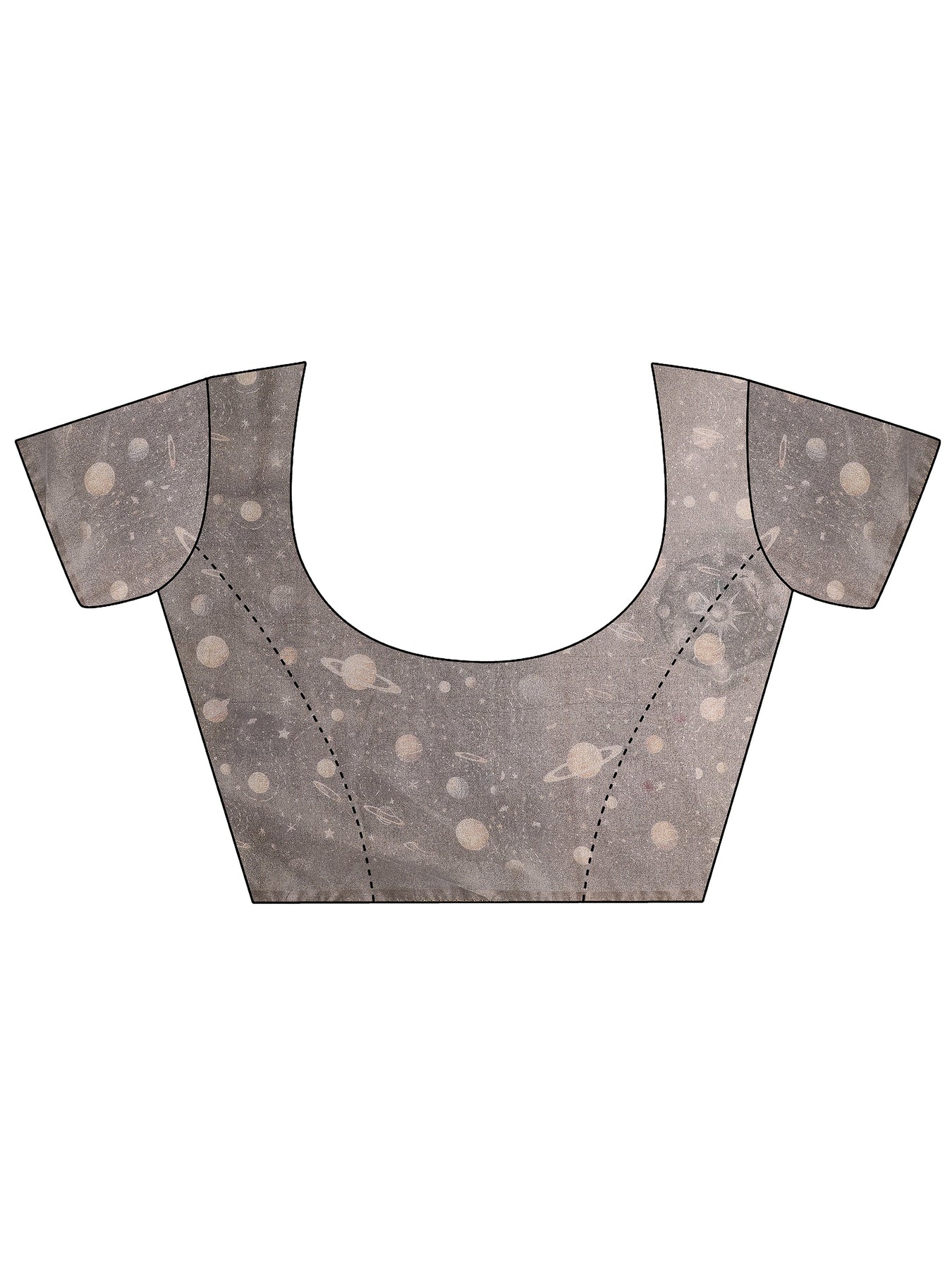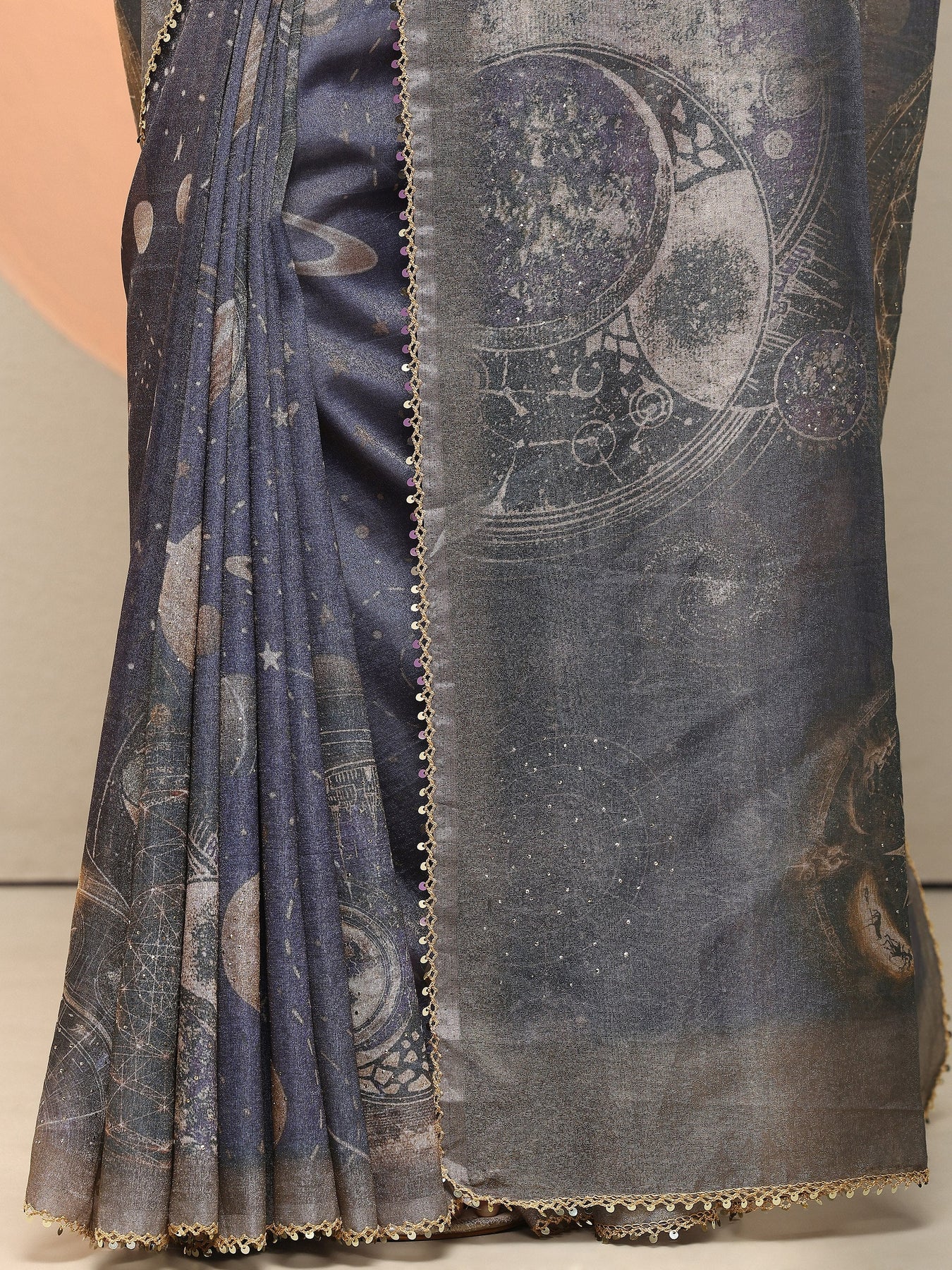 Our Navy Blue Printed Silk Blend Saree Features Captivating Celestial-Inspired Print. Complemented With A Blouse Piece. This Charming Saree Is Perfect For Festive Occasions.