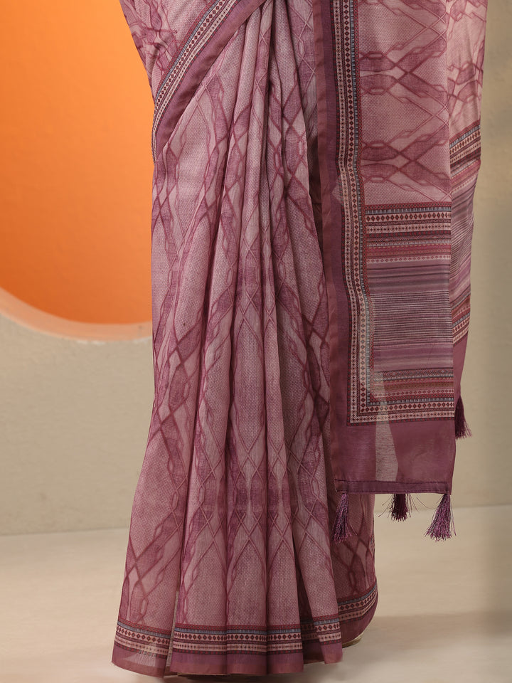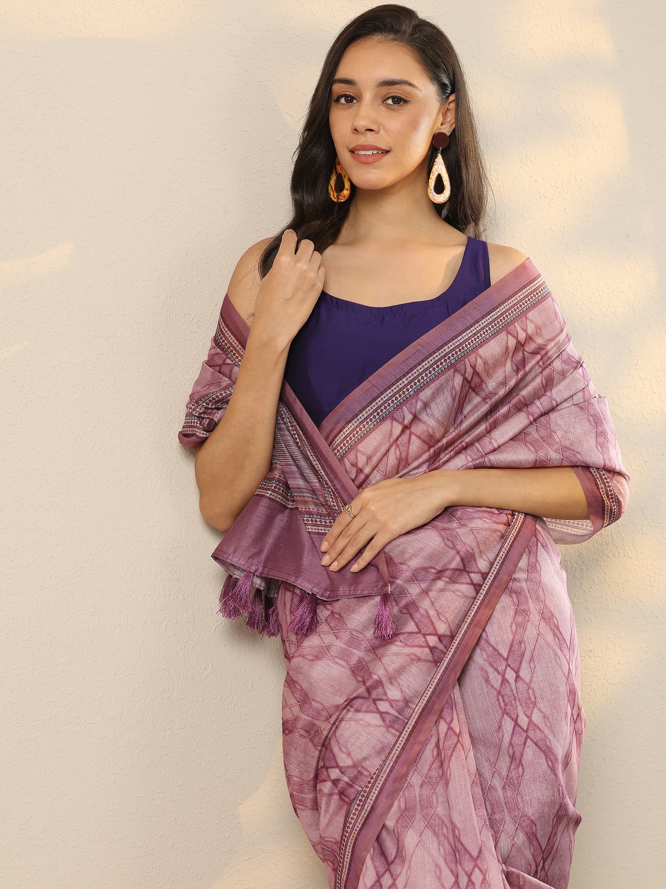 Purple Printed Silk Blend Saree With Unstitched Blouse Picece