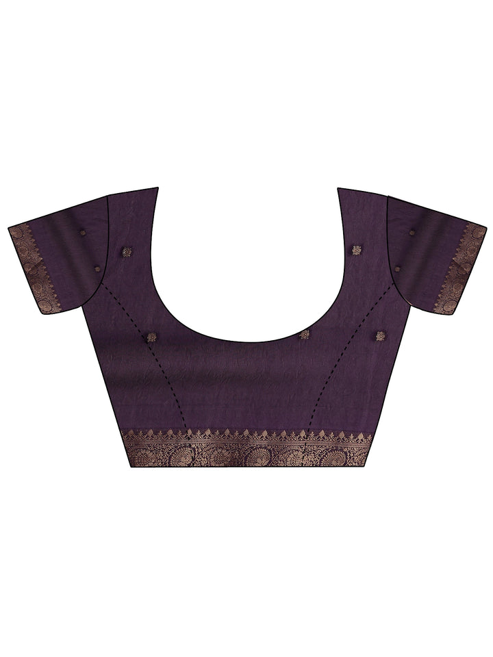 Our purple silk blend saree features captivating floral print. Complemented with an unstitched blouse piece. This charming saree is perfect for festive occasions.