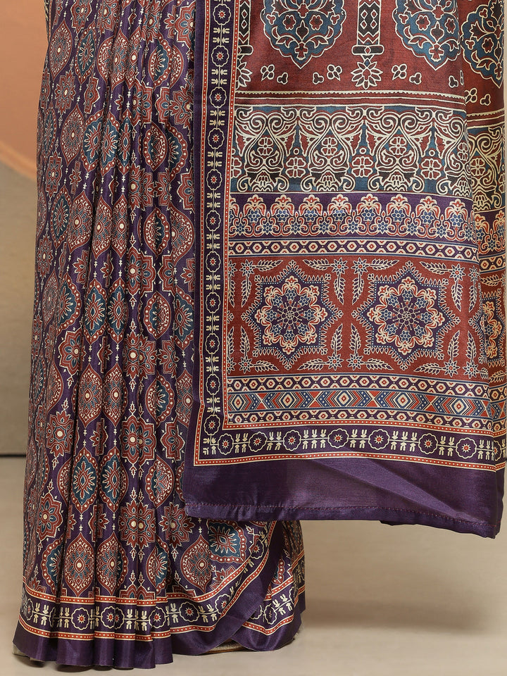Our Purple Printed Silk Blend Saree Features Captivating Embellishments. Complemented With A Stitched Blouse. This Charming Saree Is Perfect For Festive Occasions.