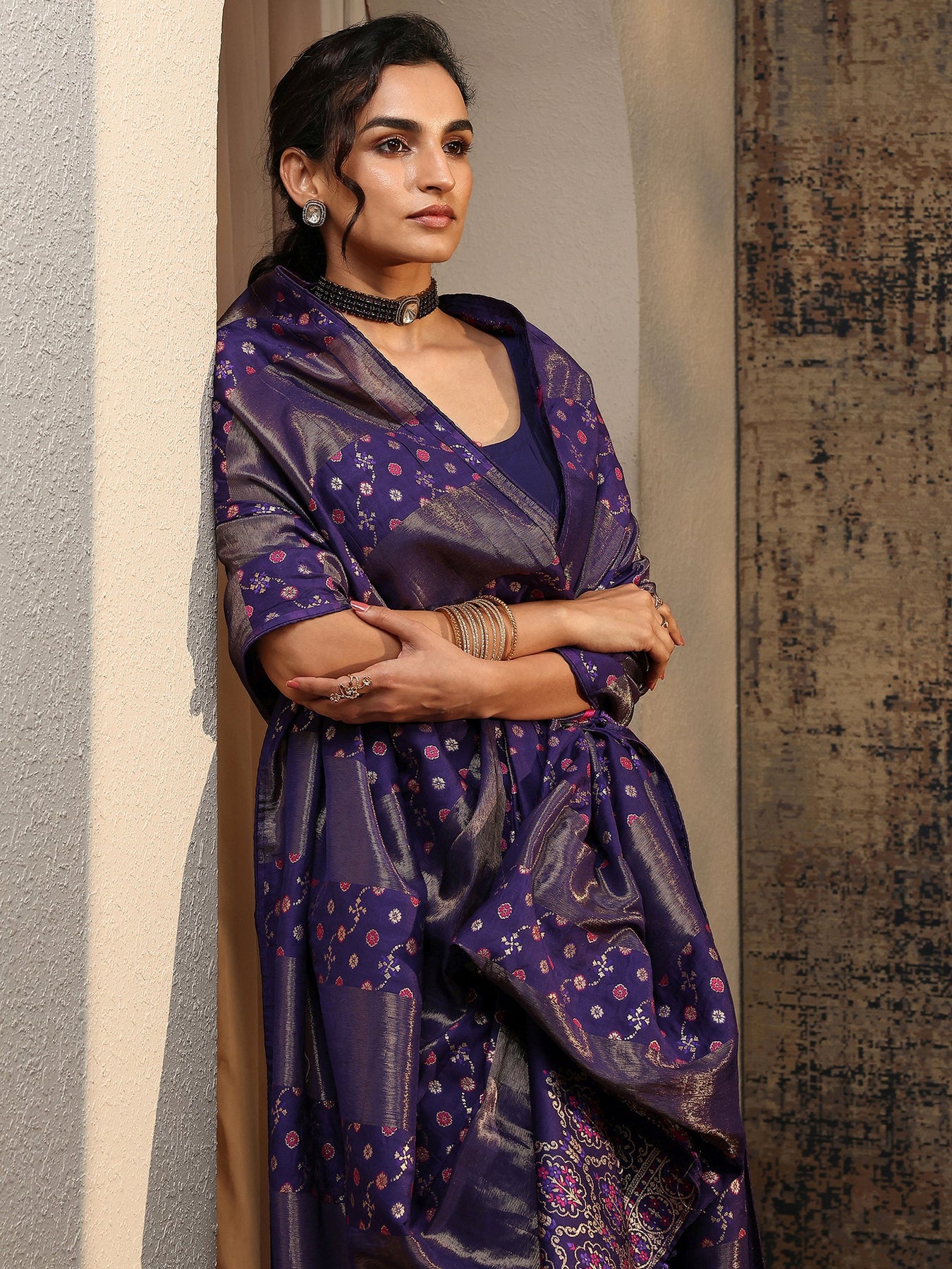 Accessorise with a statement choker, a box clutch, and embellished juttis for an elegant look.