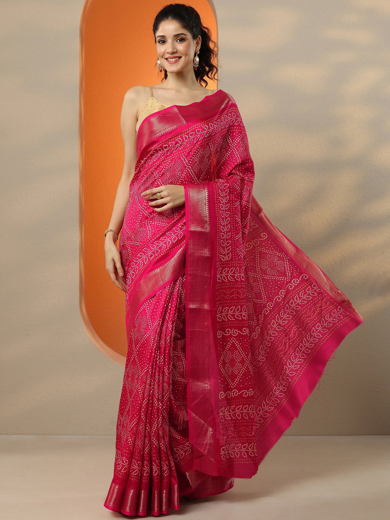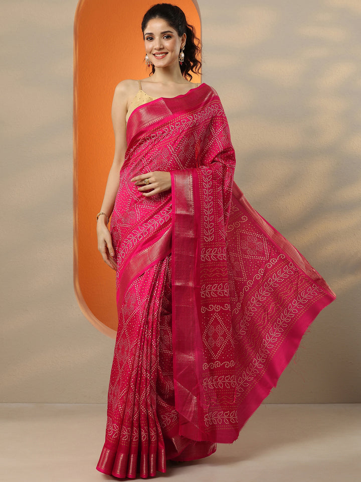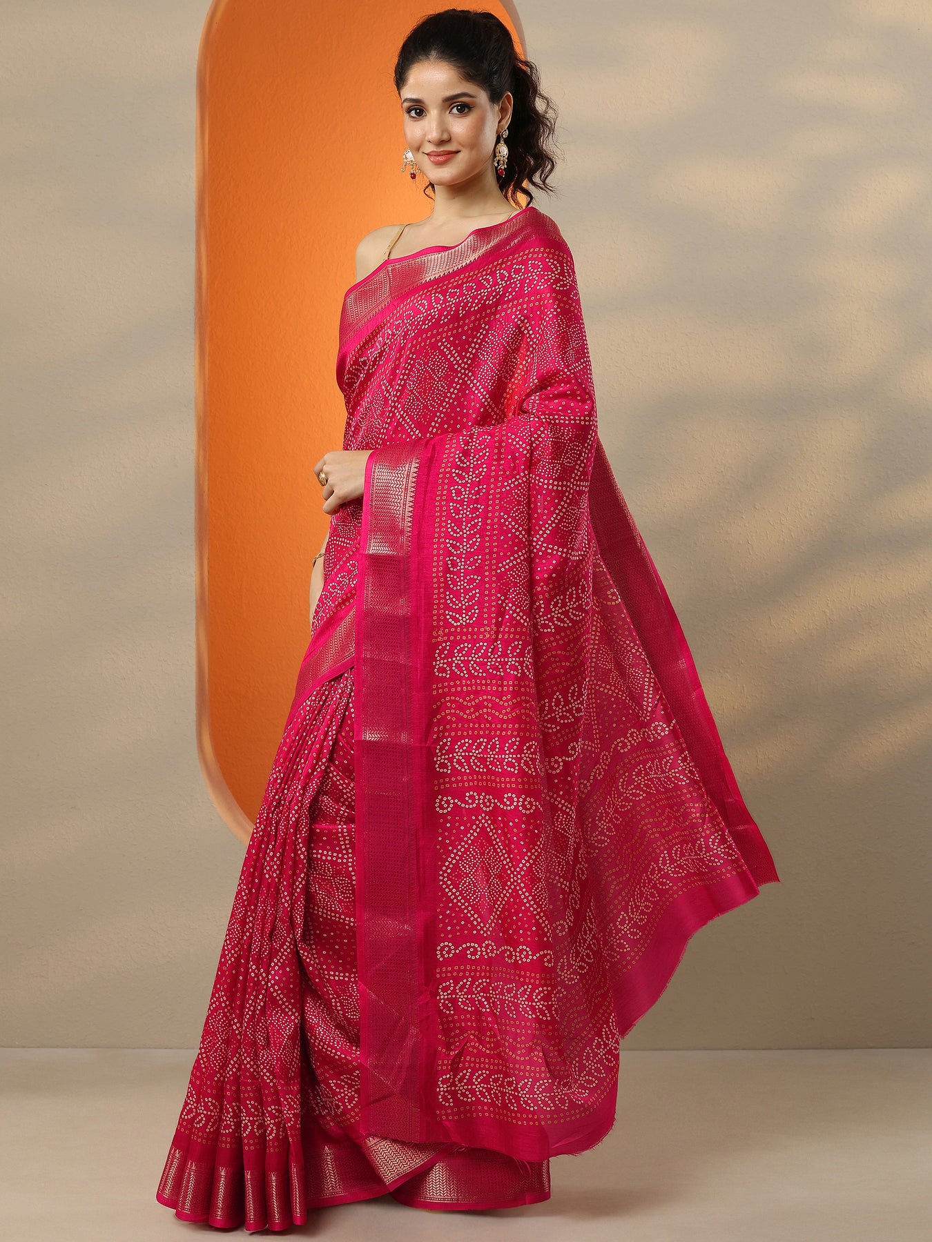Red Bandhani Printed Silk Blend Saree With Unstitched Blouse Piece