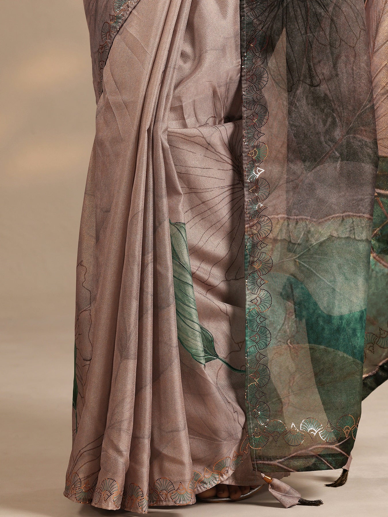 Our Taupe Printed Silk Blend Saree Features Captivating Leaf Print. Complemented With A Blouse Piece. This Charming Saree Is Perfect For Festive Occasions.
