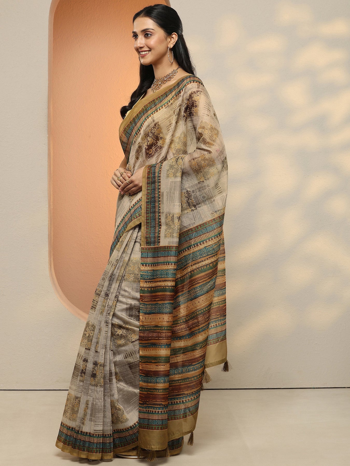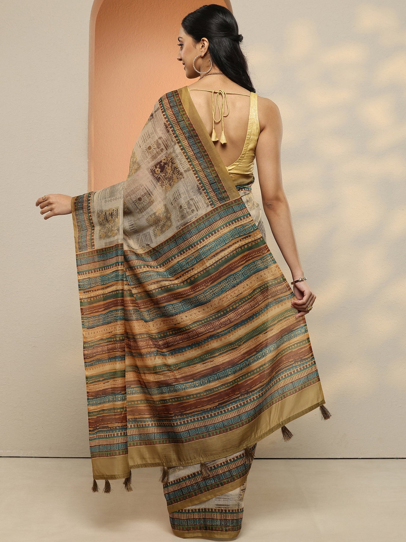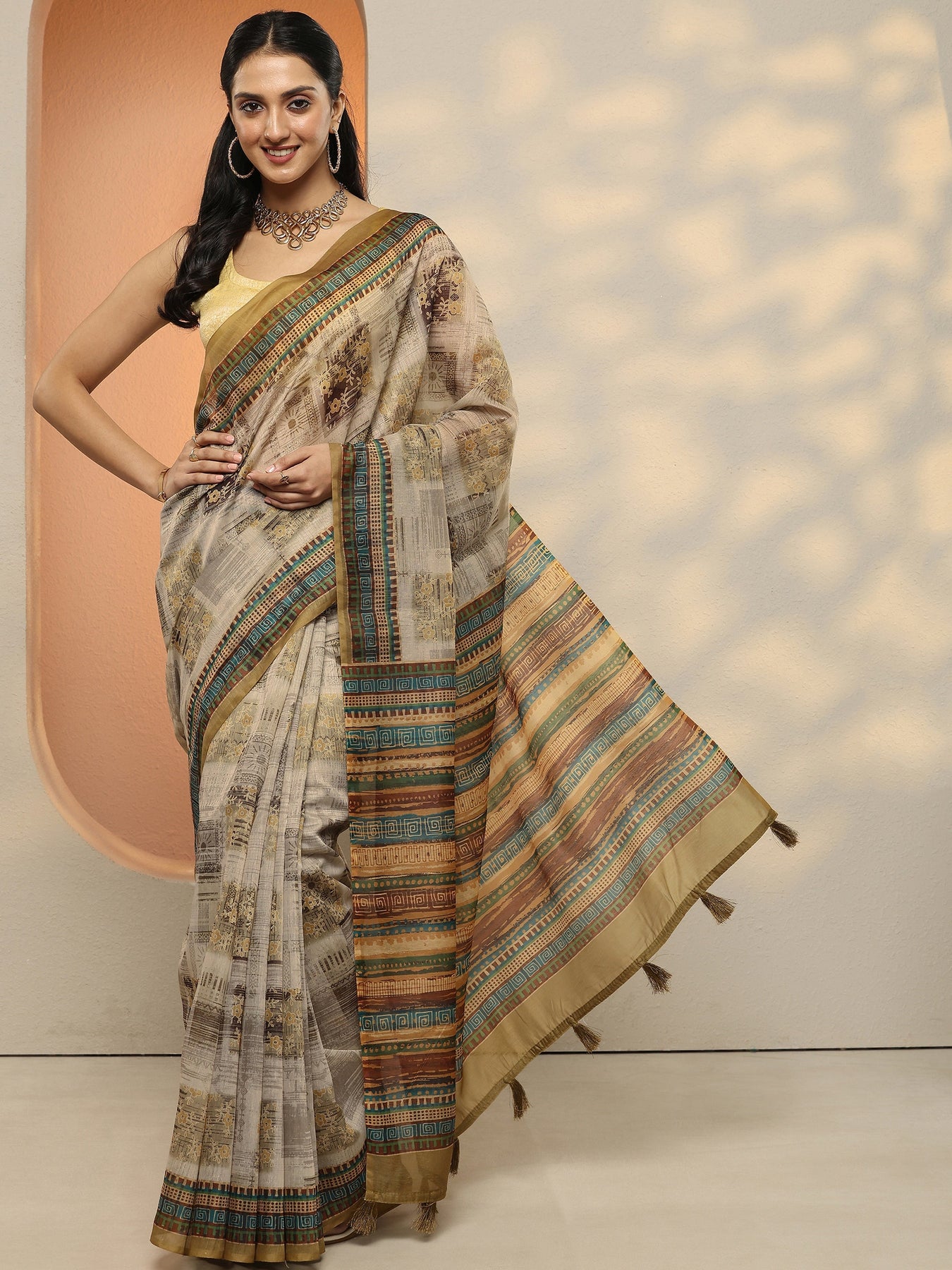 Our Beige Printed Silk Blend Saree Features Captivating Top Pattern Print. Complemented With A Blouse Piece. This Charming Saree Is Perfect For Occasion.