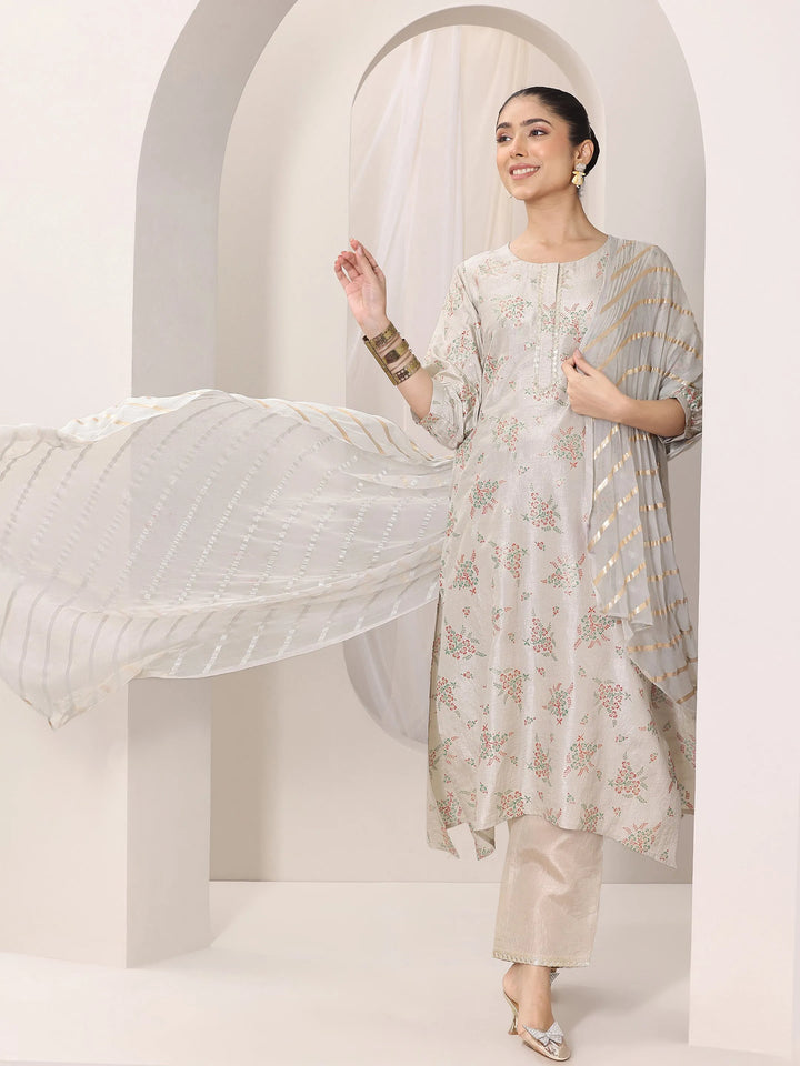 Grey Woven Design Silk Blend Straight Suit Set With Dupatta