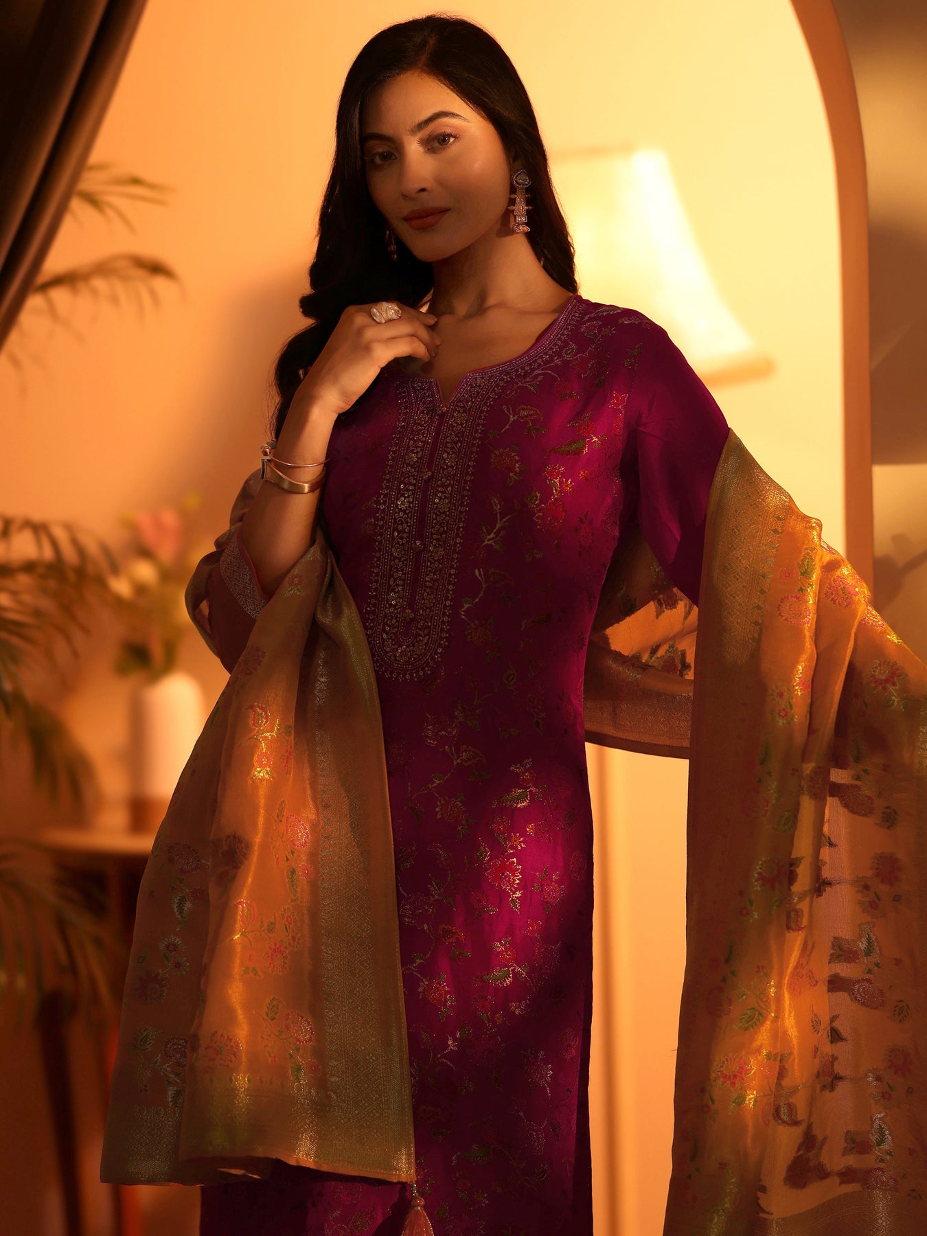 Libas Art Pink Woven Design Silk Blend Straight Suit Set With Dupatta