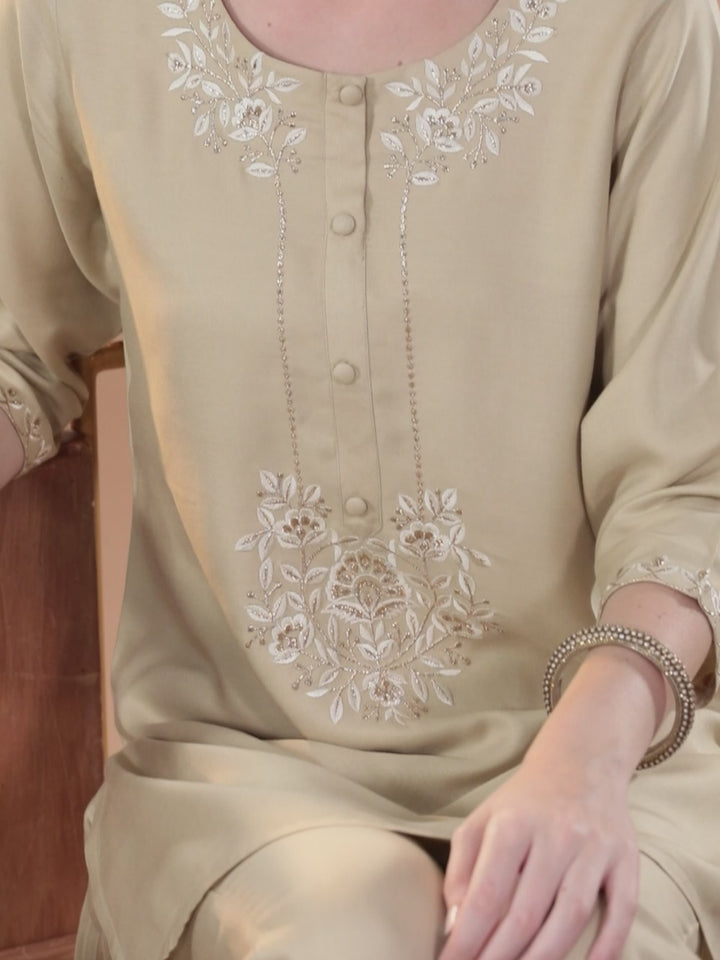 Our 2-piece beige pashmina wool blend kurta set features a straight-fit kurta with a round neckline, three-quarter sleeves, and a statement yoke. Complemented with trousers with a partially elasticated waistband and roomy pockets. Adorned with delicate floral embroidery and handmade fabric buttons, this style is perfect for casual outings.