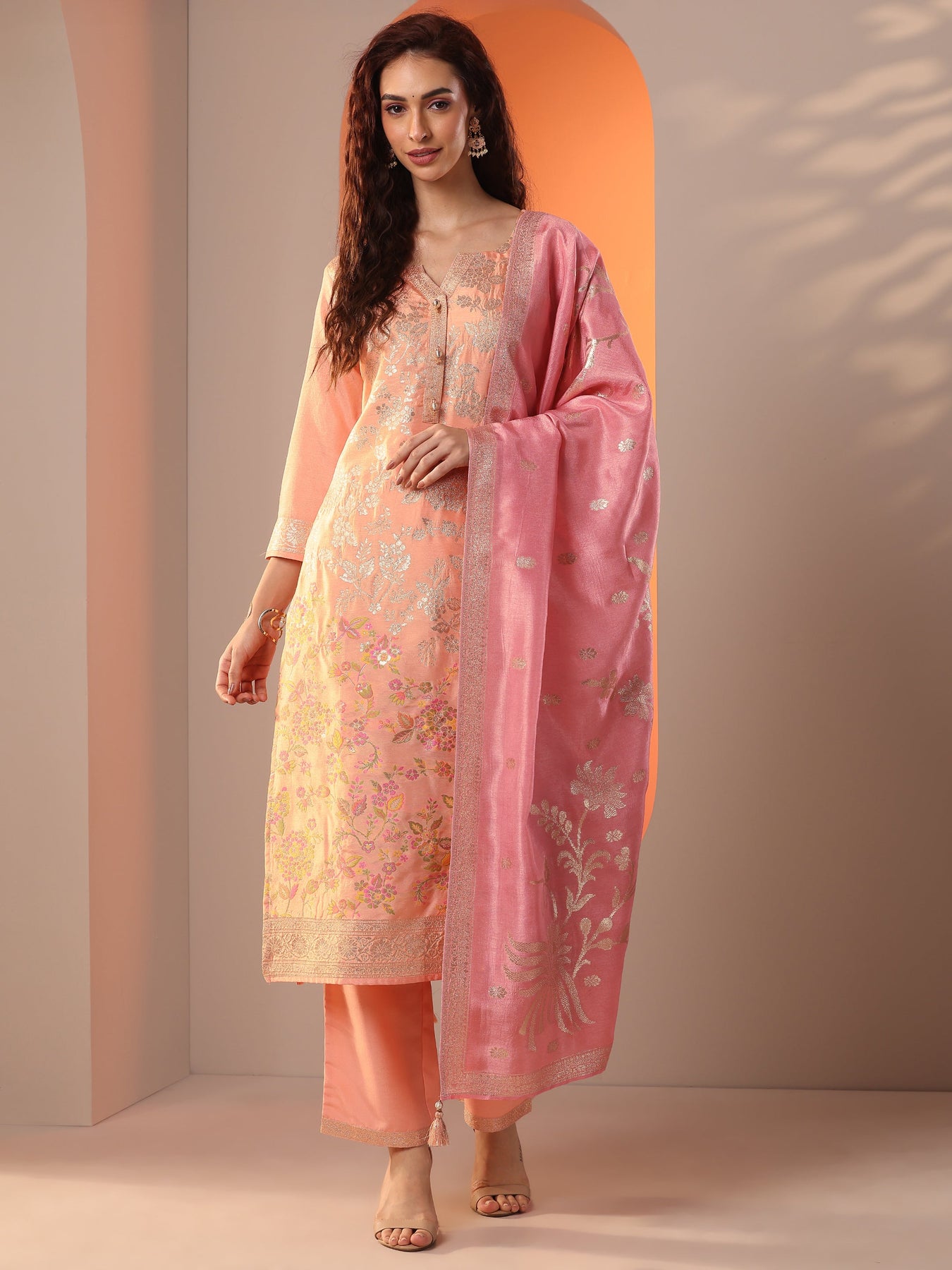 Peach Woven Design Silk Blend Straight Suit Set With Dupatta