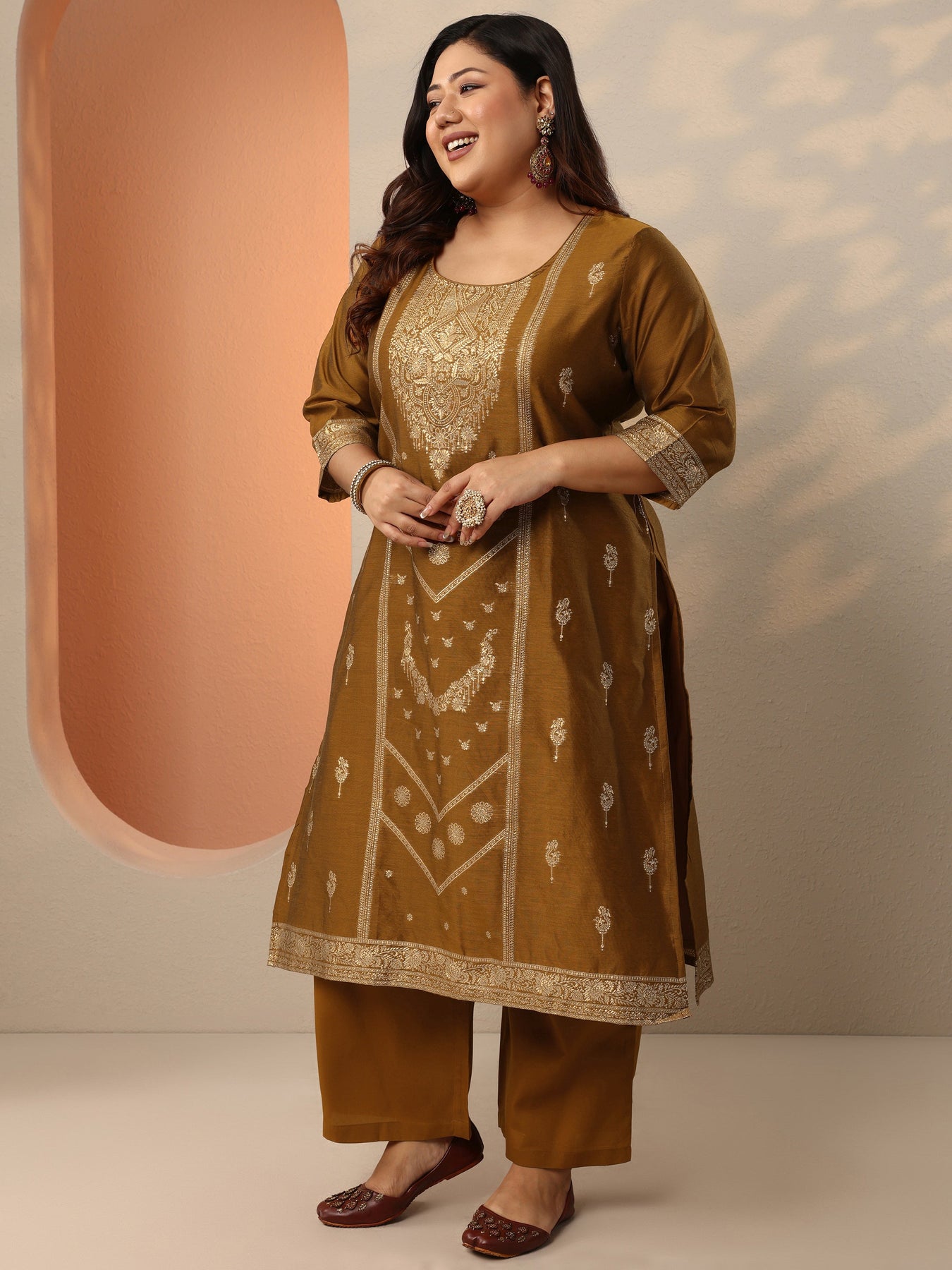 Plus Size Bronze Woven Design Silk Blend Straight Suit Set With Dupatta