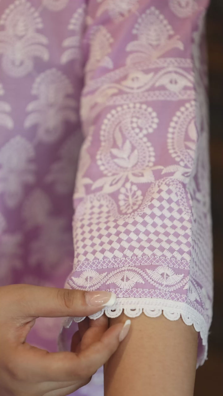 Our 2-piece purple embroidered cotton co-ord set features an A-line kurta with a stylised neckline and three-quarter sleeves. Complemented with trousers with a partially elasticated waistband. Elevated with intricate ethnic motifs embroidery and lace accents, this style is perfect for light festivities.