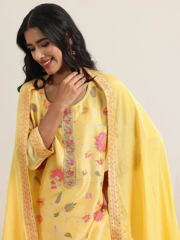 Yellow Woven Design Silk Blend Straight Suit With Dupatta